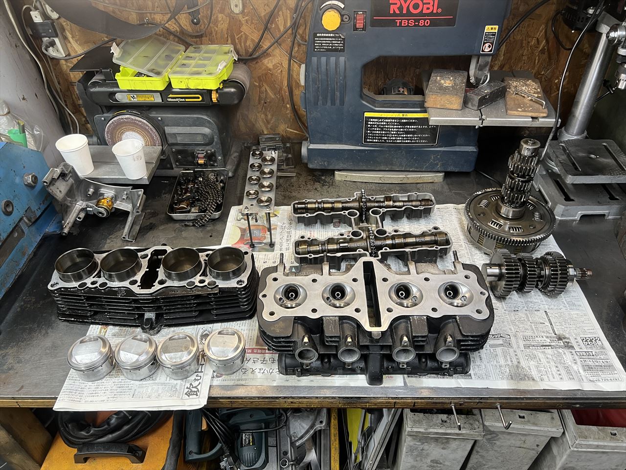 エンジン分解点検の続きです。詳細に点検するため、各部品を洗浄します。ヘッドはカーボンも落とします。エキゾーストポートは堆積したカーボンでだいぶ狭くなっていました。