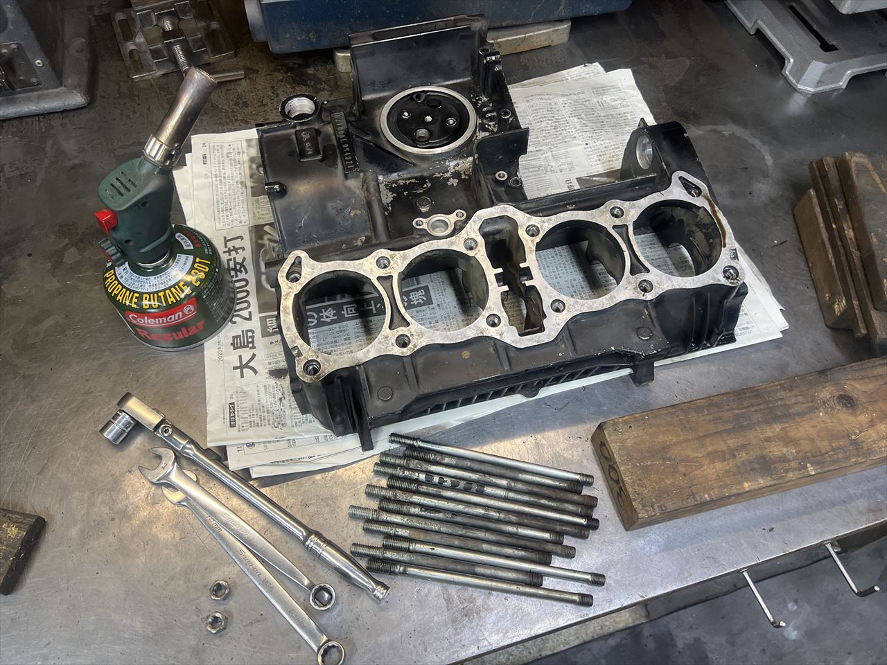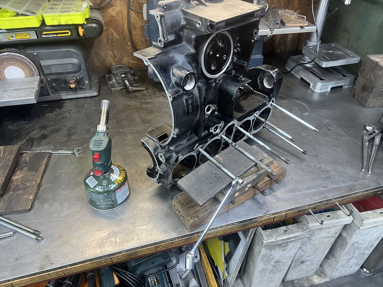 クランクケースは古くなったシリンダーのスタッドボルトを抜きます。かなり固着していたので、バーナーで根元を熱してから外します。