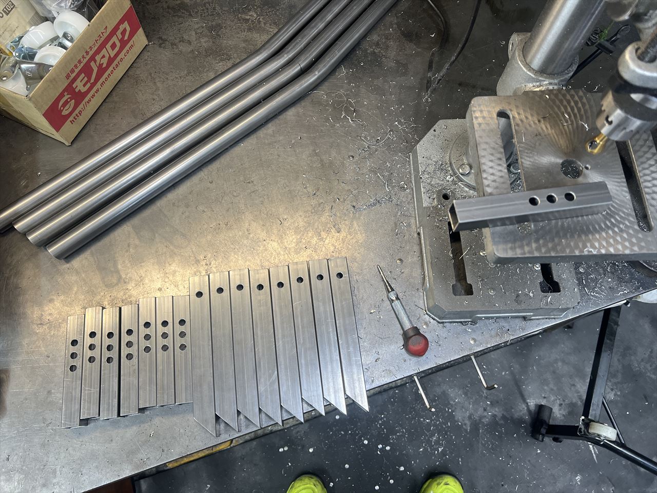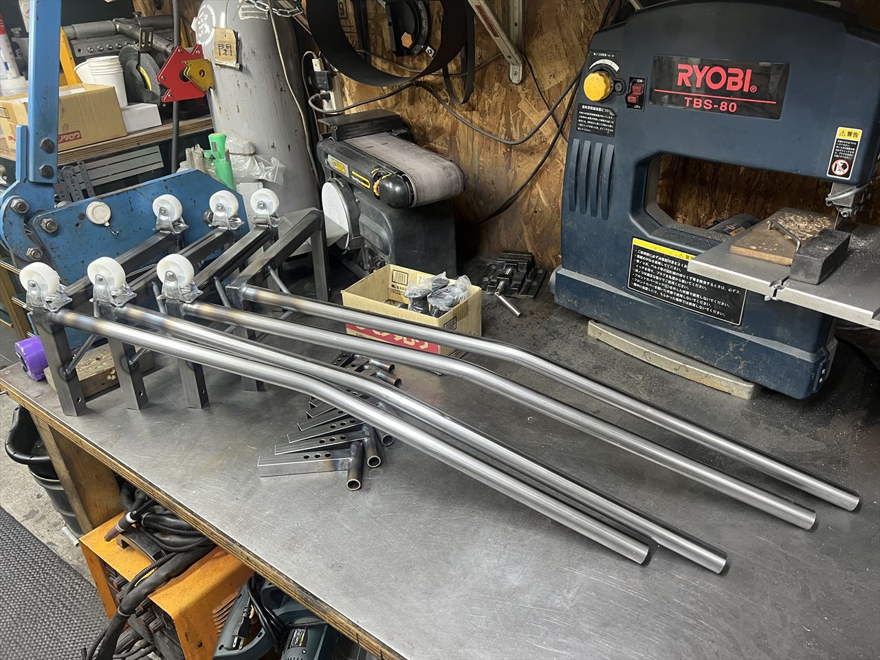 投稿日: 2023年12月4日2023年12月4日 投稿者: greengarageフレームスタンドを製作しています ご注文いただいている分を数台まとめて製作します。先ずはスチールパイプを切り出します。 穴位置をケガキます。 穴加工します。 溶接で組み立てます。このあと刷毛で塗装すれば完成です。完成までもうしばらくお待ちください。