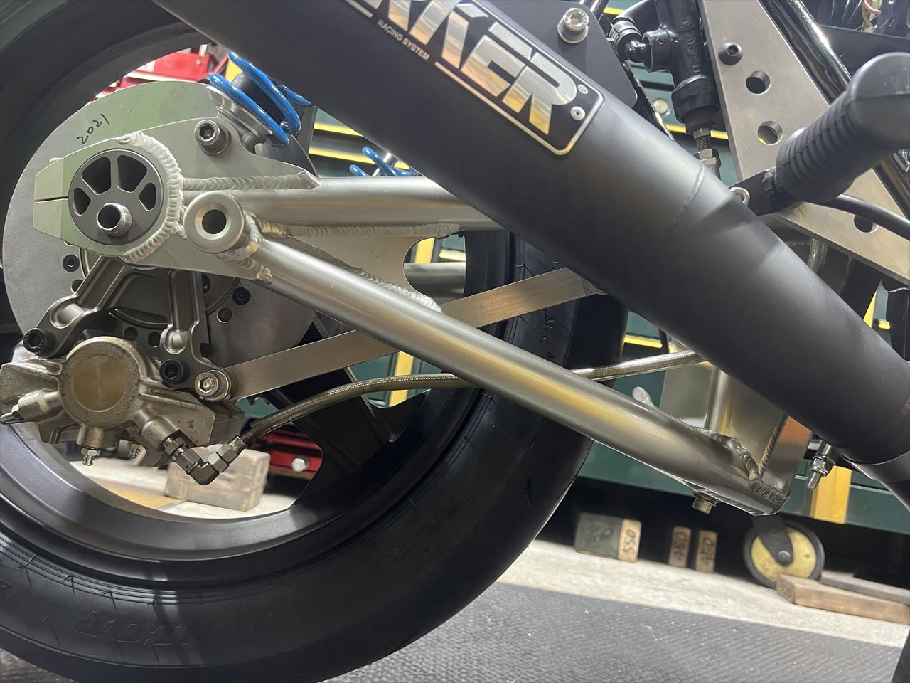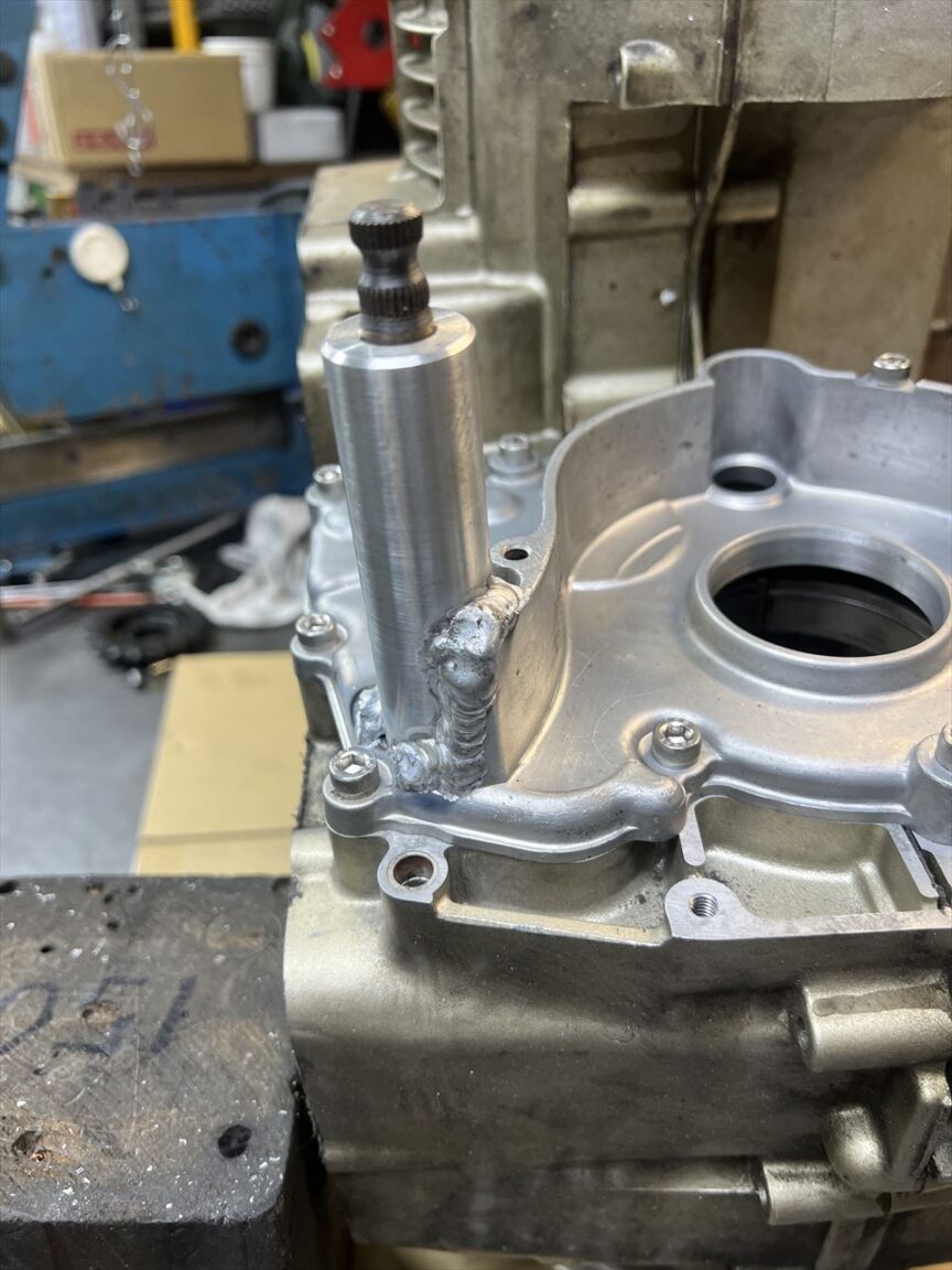 ガイドを溶接します。これによりシフトシャフトを外側でも支える構造となり、スプロケットカバーを省略できます。