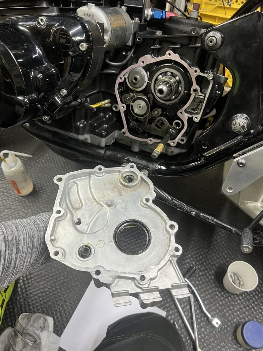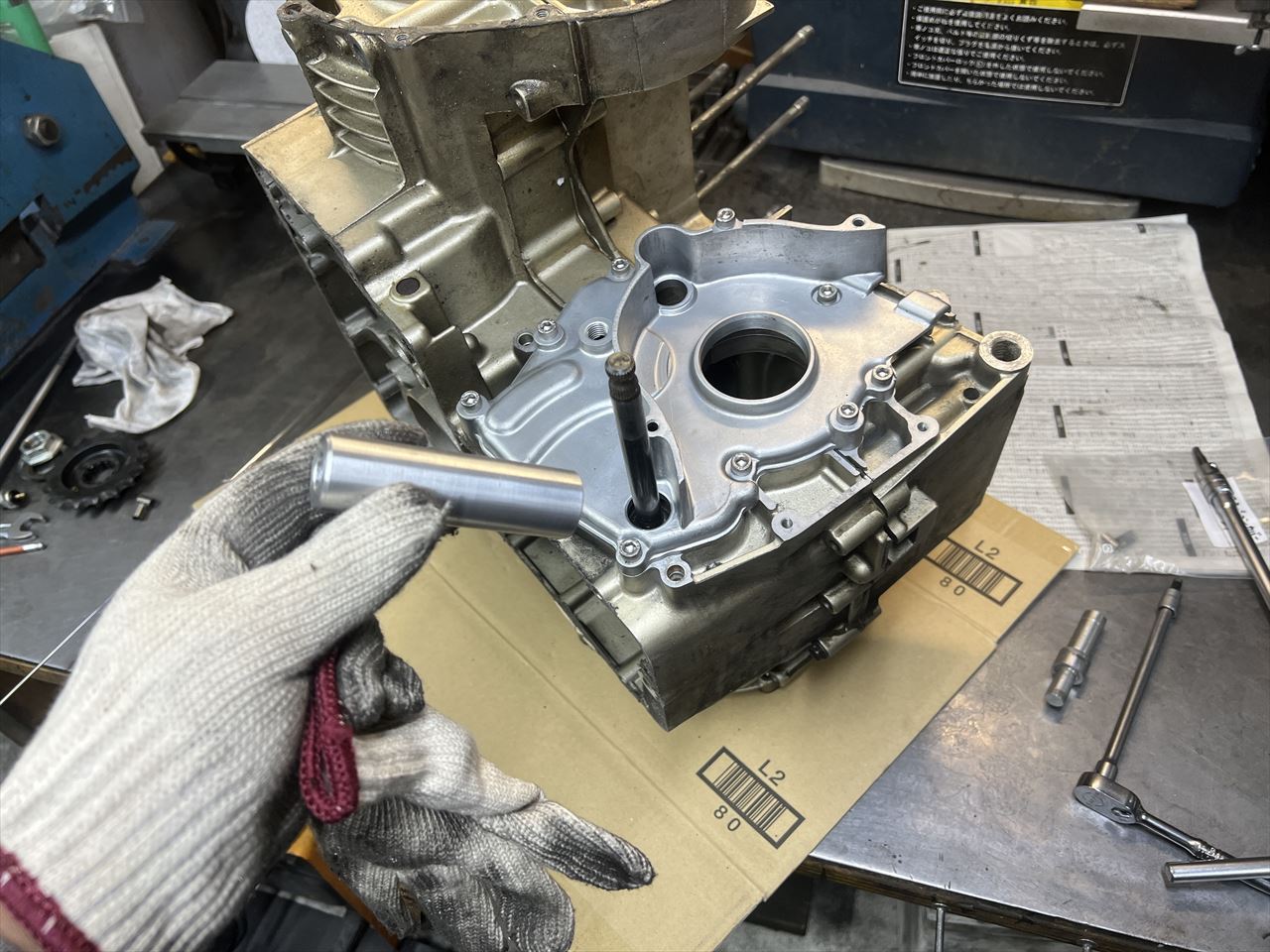 オイルシールを外し、治具代わりのダミーエンジンに取り付けます。
