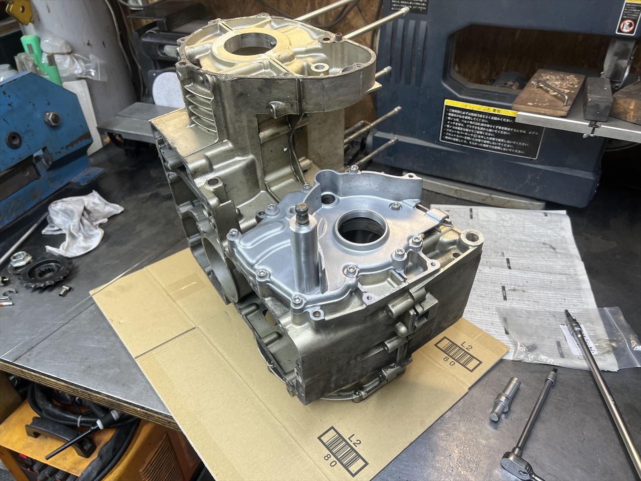 続いてワークスクラッチレリーズ関係の加工です。ミッションカバーにガイドパイプを溶接するのでカバーを外します。
