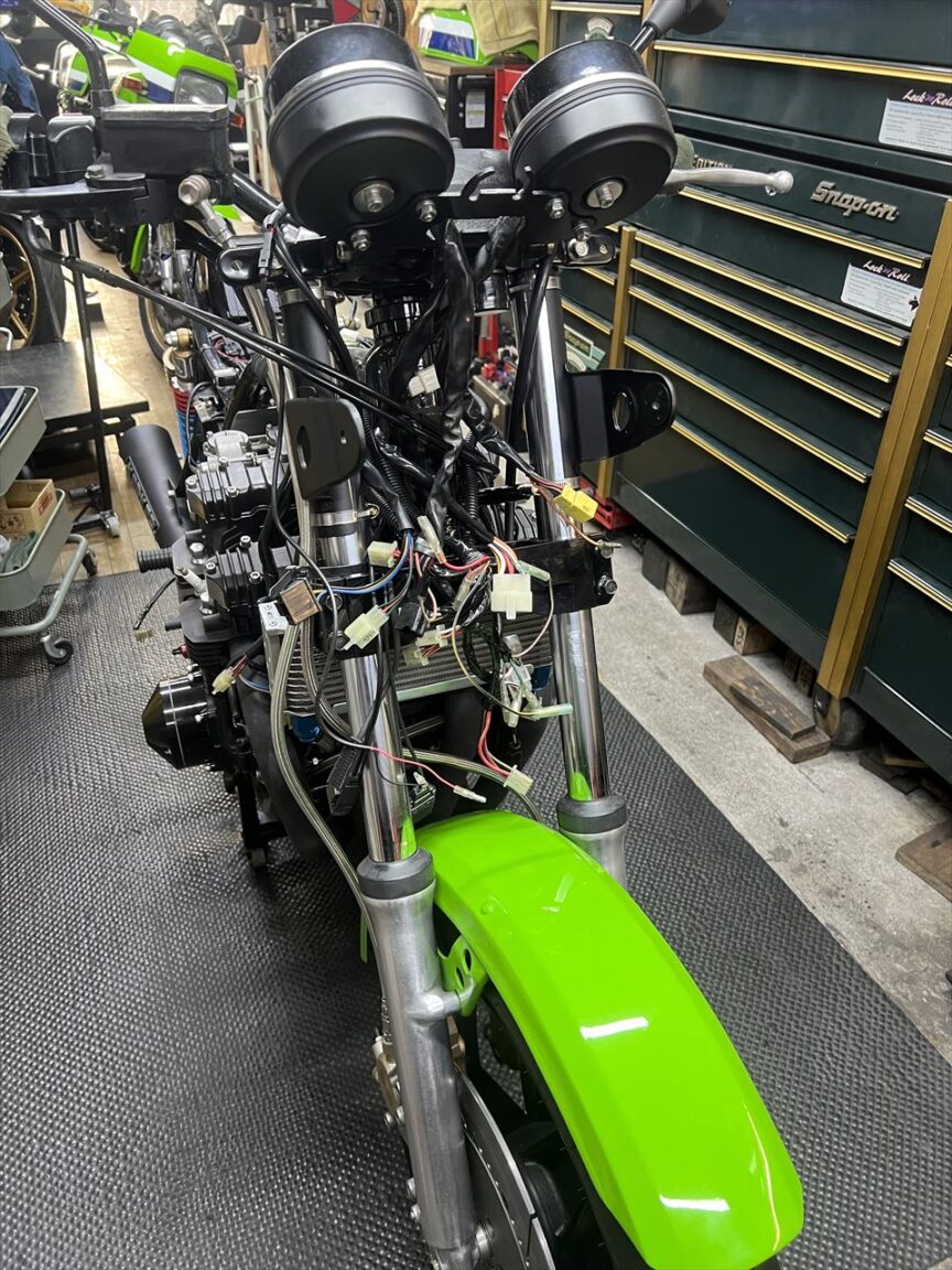 修正加工したライトステーを付けてヘッドライトの高さをカウルに合わせます。