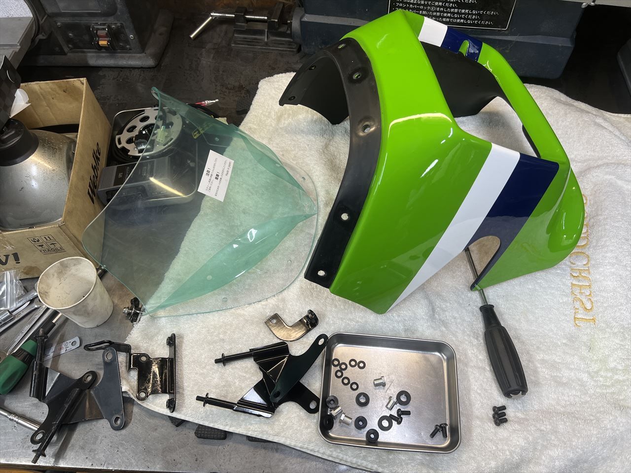 続いてフロントカウルを準備します。スクリーンはクリアにします。使用するのは高強度なポリカーボネート製で純正形状のアクリポイントのスクリーンです。合わせてライトステーセットと小物類も更新します。