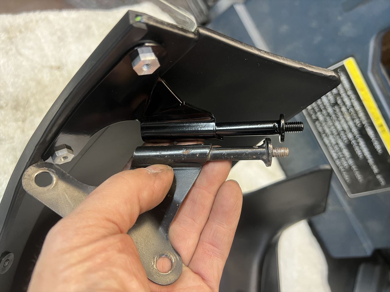 既存のライトステーはフォークオフセット60ミリ用の短い方でした。これではカウルとメーターが干渉するので長いPMC製のステーに変更します。