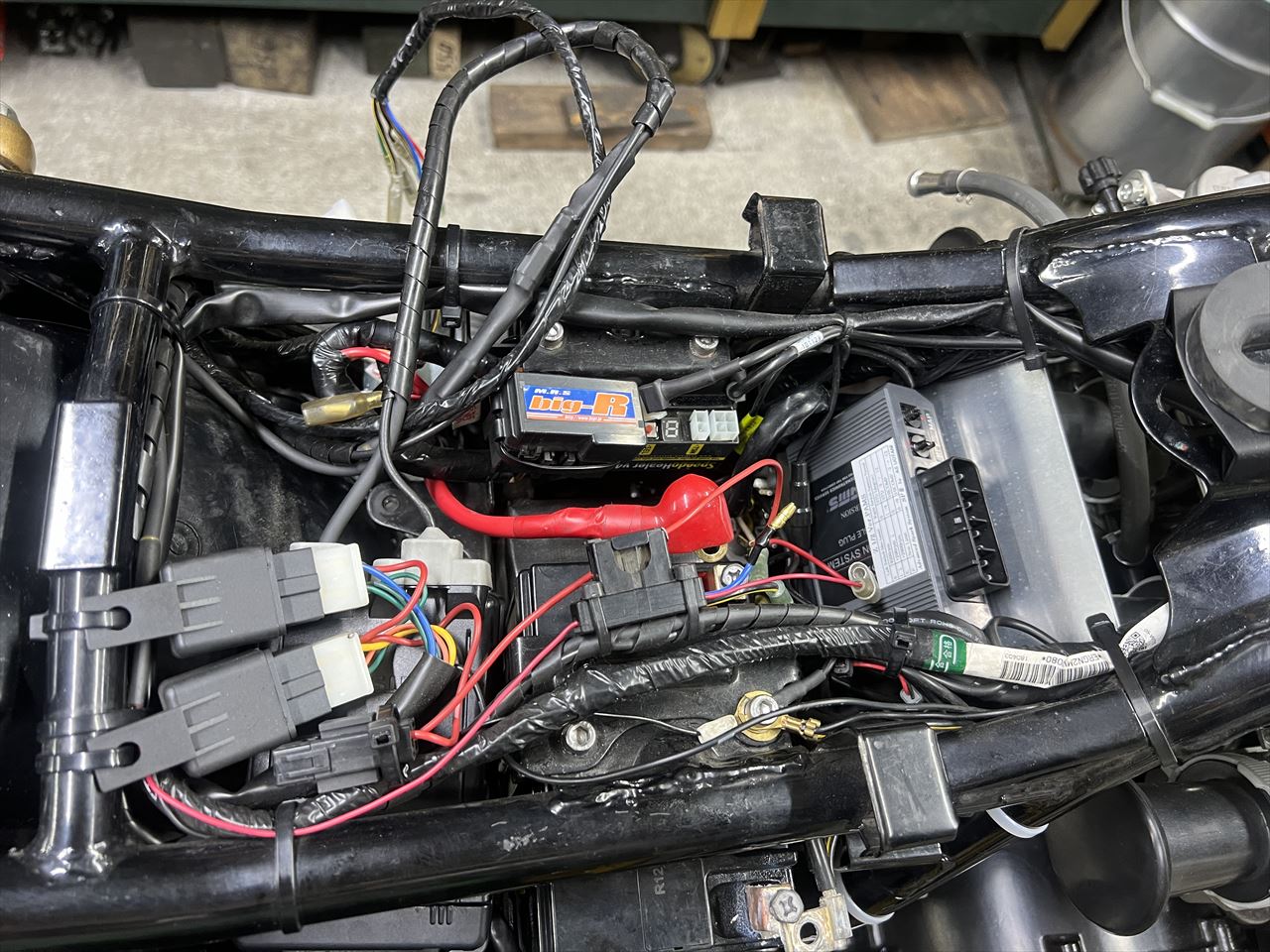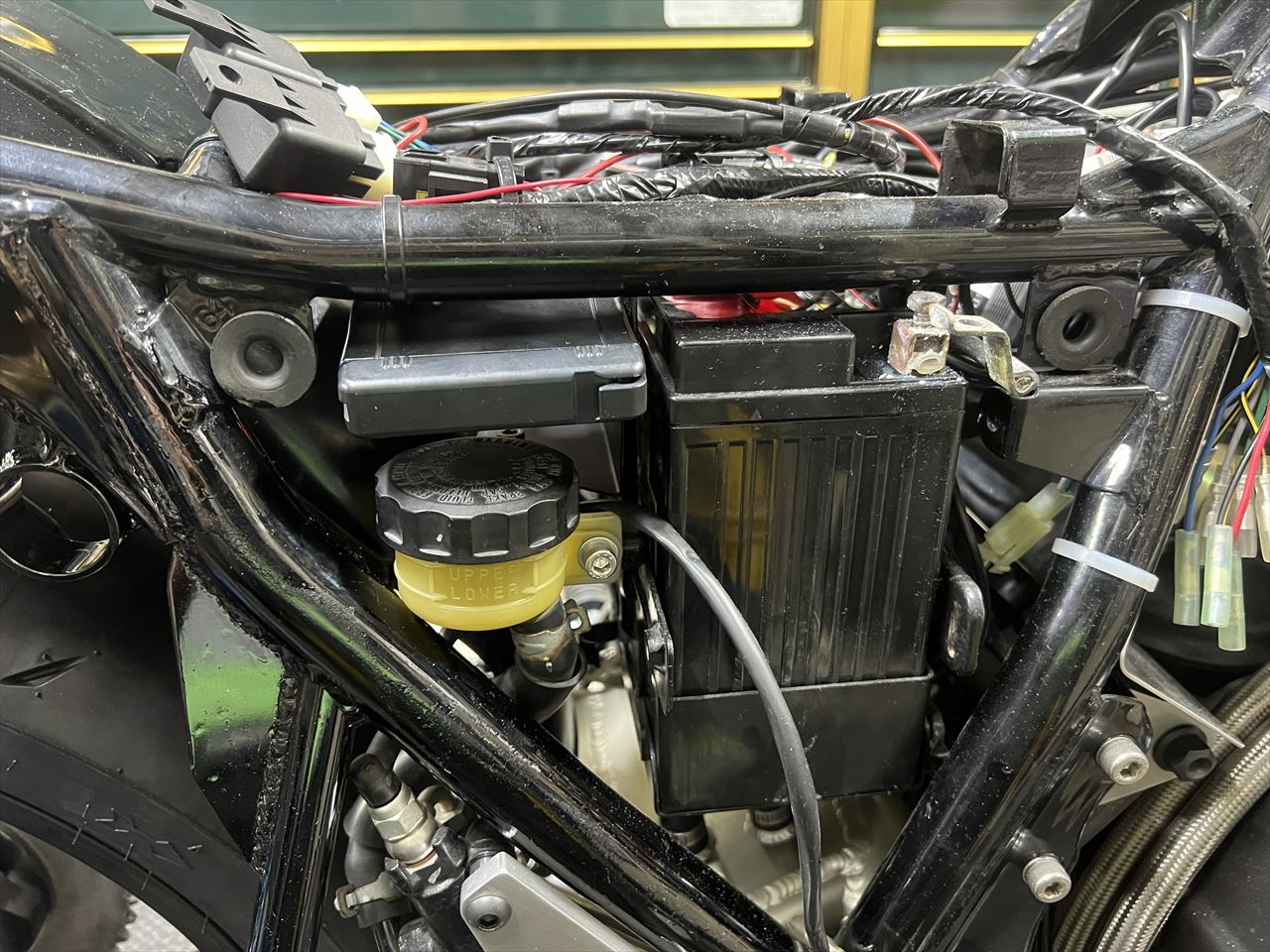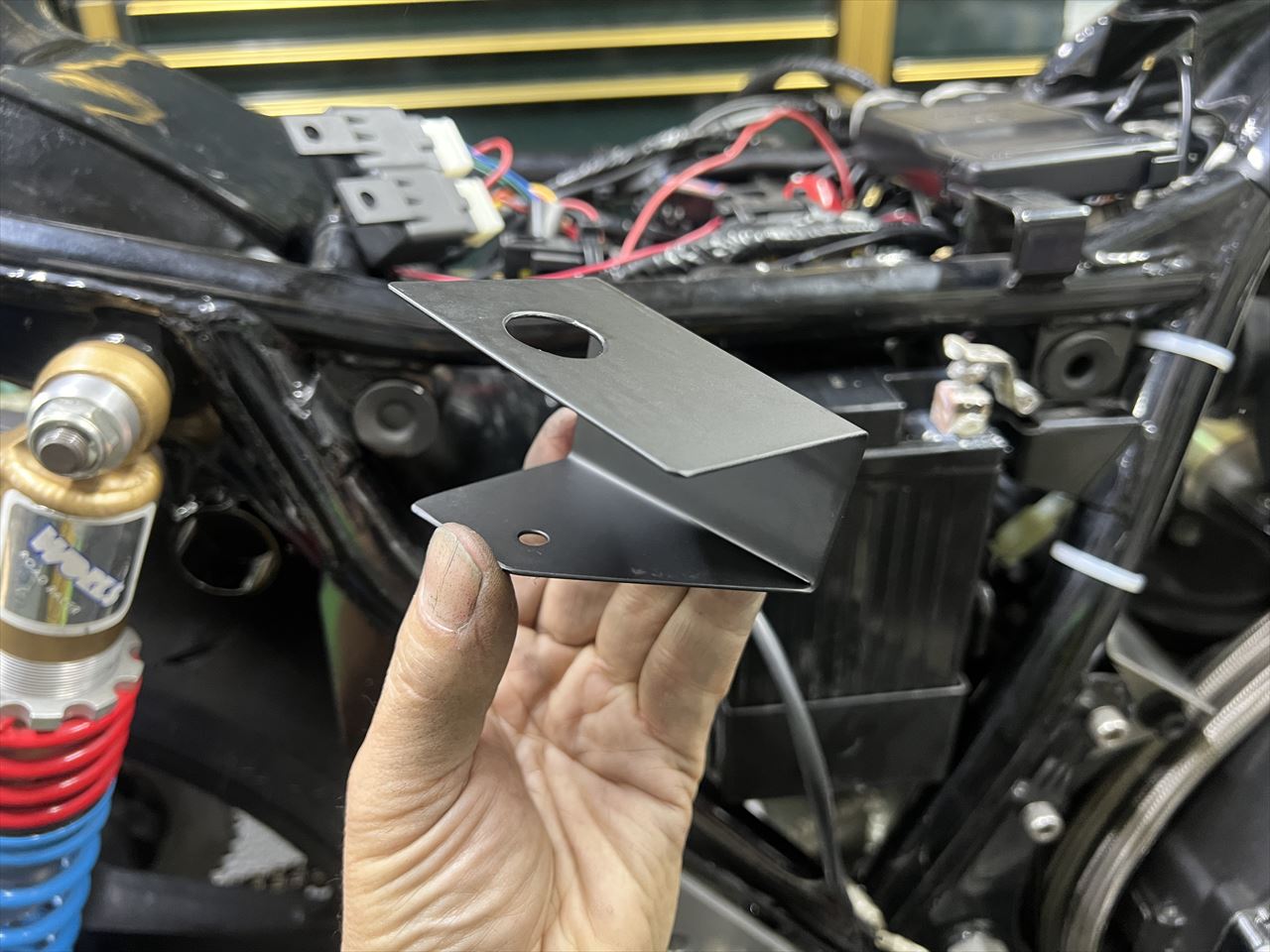テール周りは一体化するので、テールカウル内は物入としては使えなくなります。既存のETC車載器はバッテリー後ろ側のスペースにこのようなステーを作ってマウントすることに。