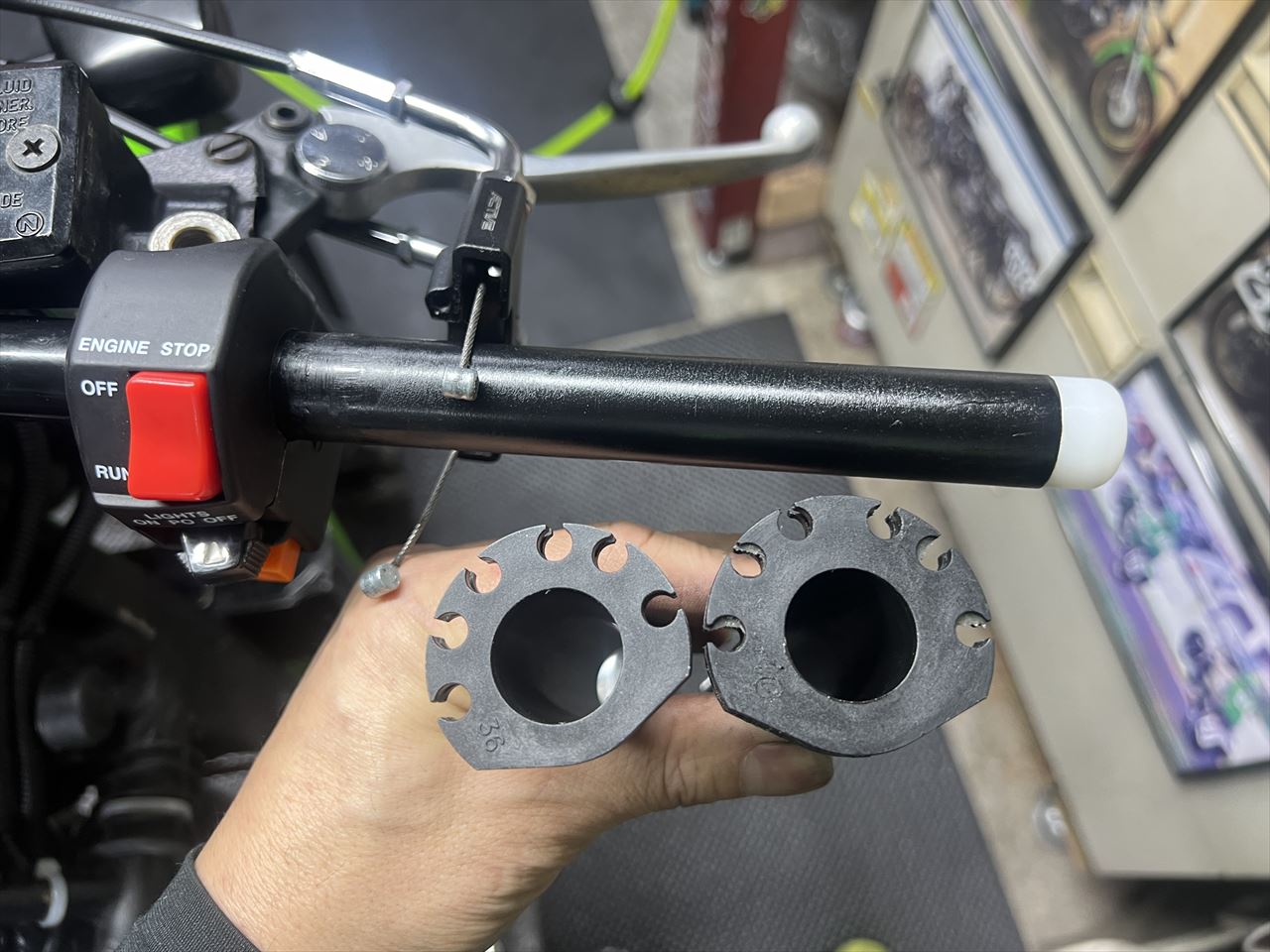 スロットル操作はやや重いので、ハイスロのスロットルは既存のφ40からφ36に小径化します。左がφ36ミリです。