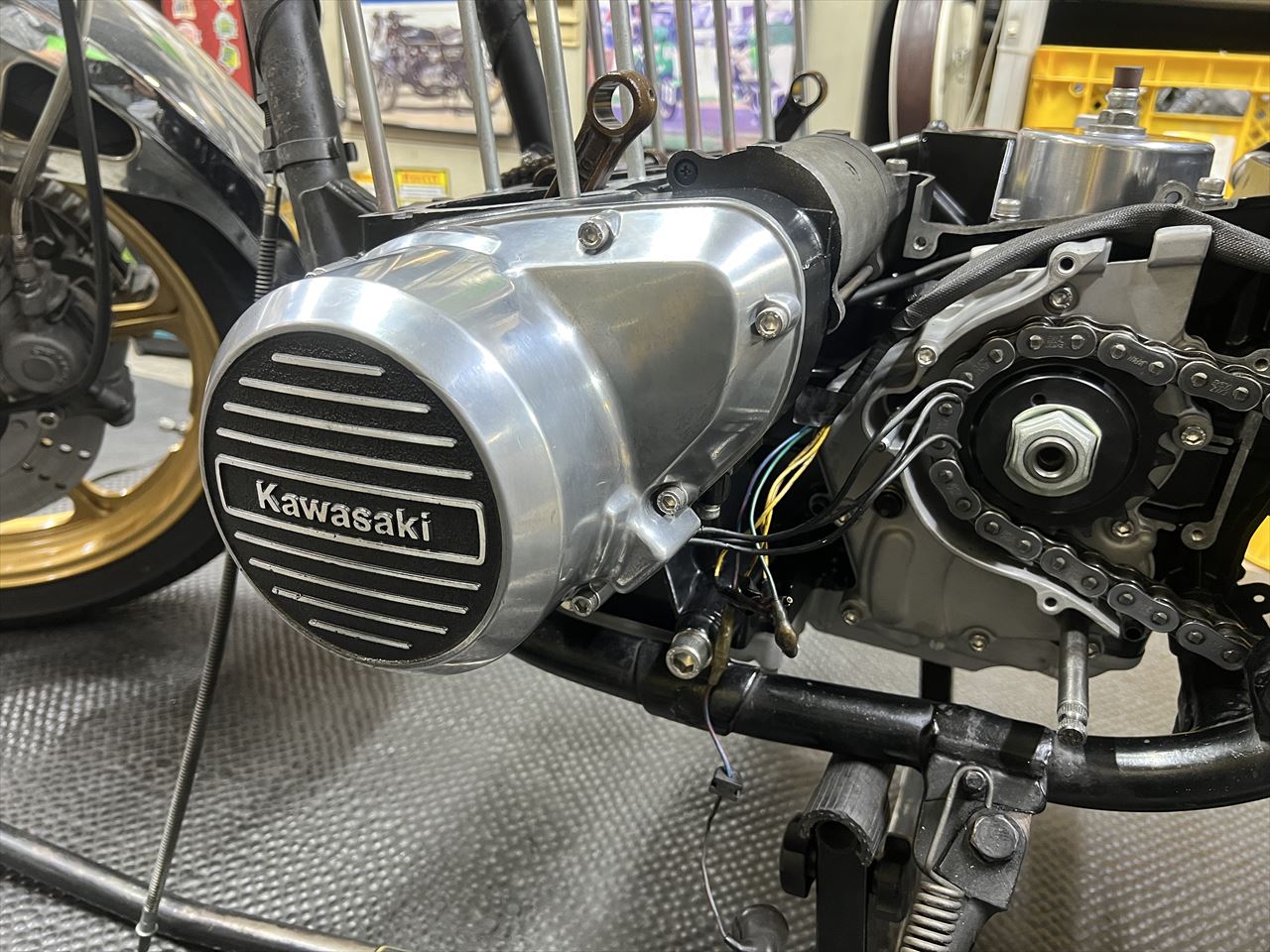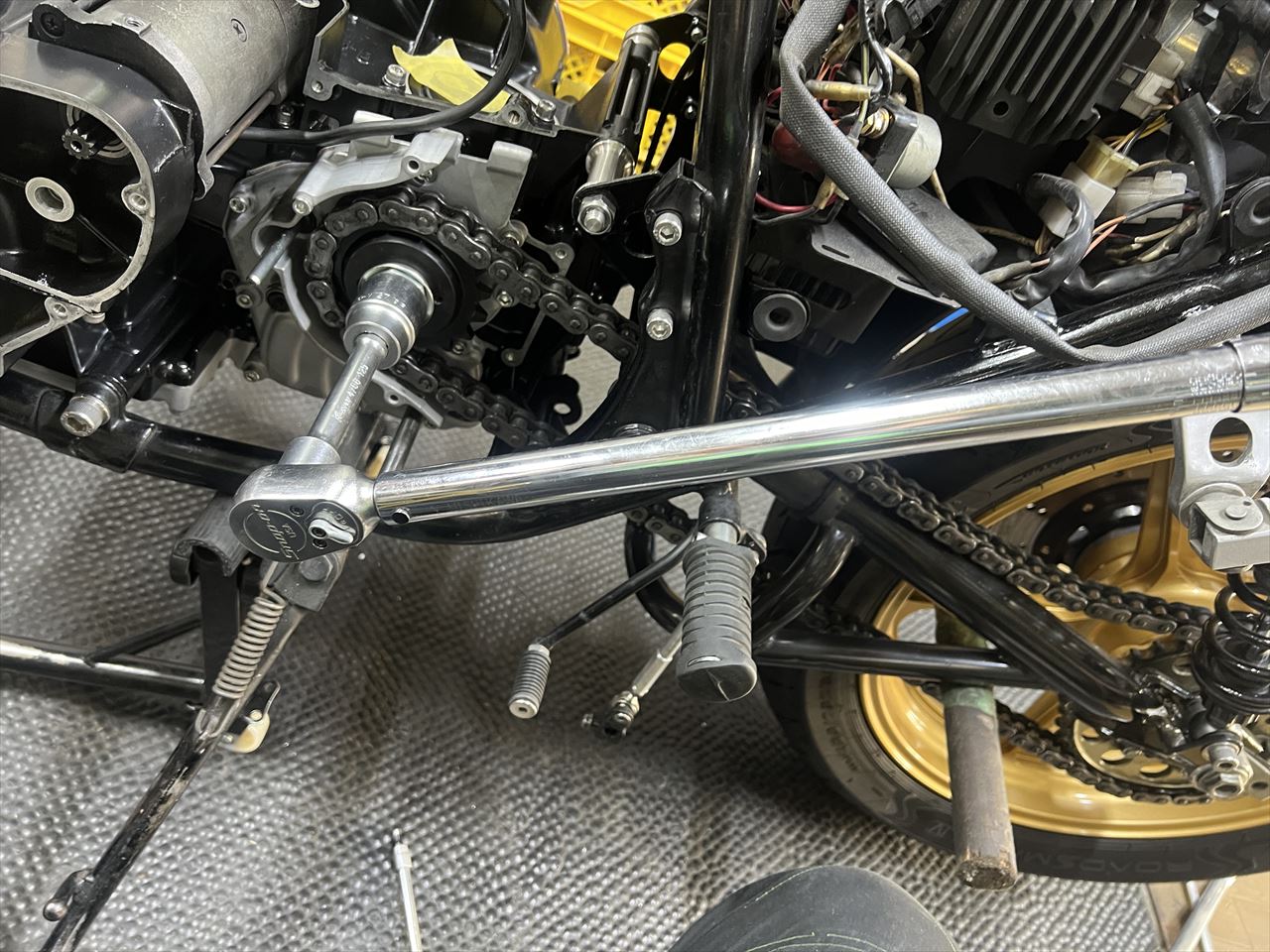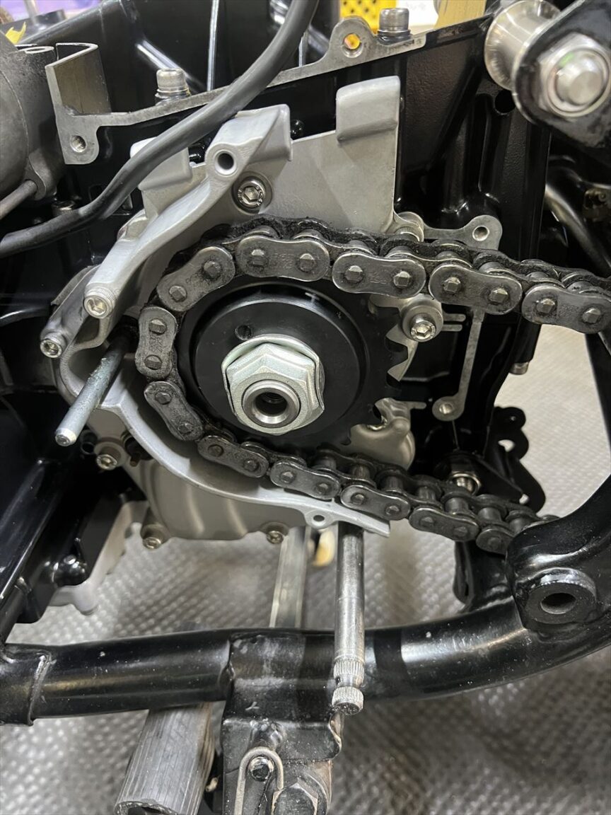 フロントスプロケを取り付け、チェーンを掛けます。10ミリ長いロングアウトプットシャフトを使用しているため、チェーンラインを5ミリオフセットにする場合は、このように5ミリオフセットスプロケを裏返して使用します。
