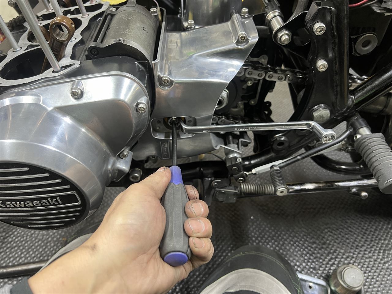 スプロケカバーを取り付け、クラッチレリーズの遊びを調整します。