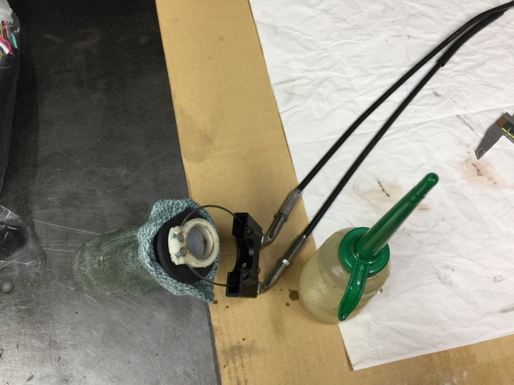 スピードメーターケーブルは継続使用です。内部が乾いているのでこちらもエンジンオイルで潤滑しておきます。
