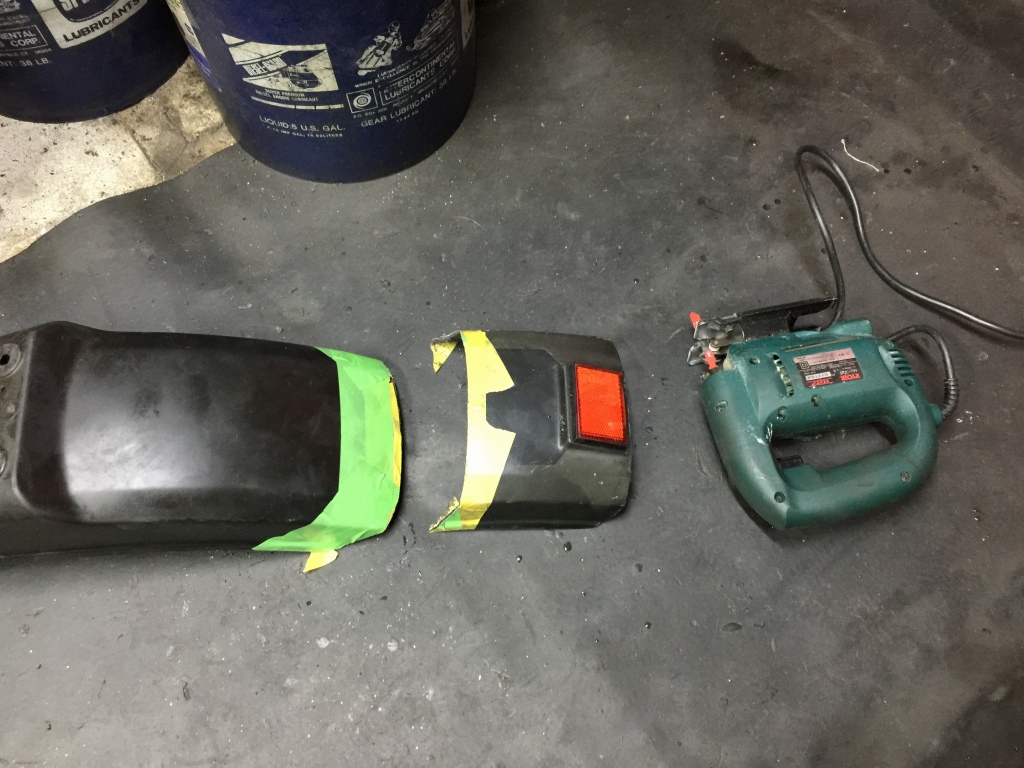 ロングフェンダーはカットして純正ショートフェンダーにします。