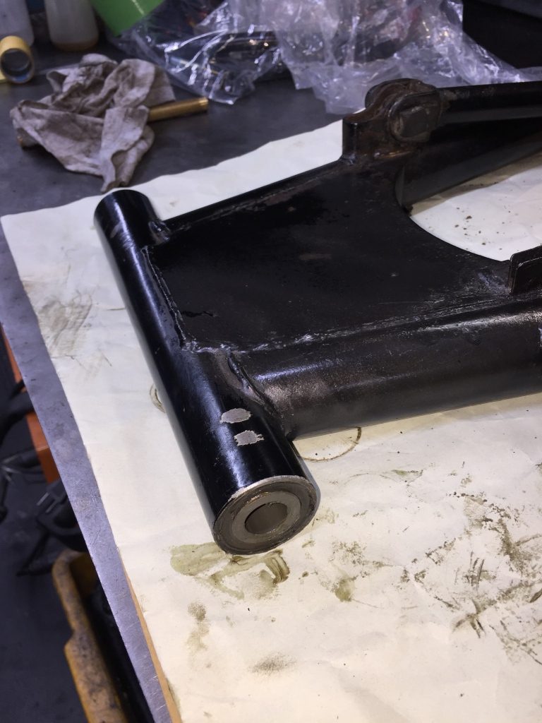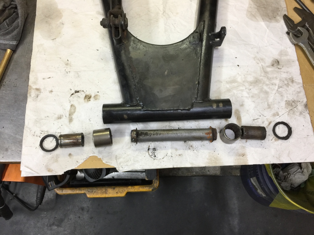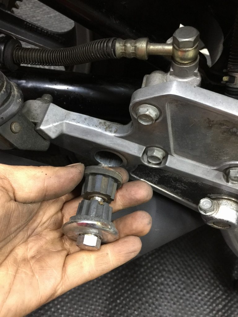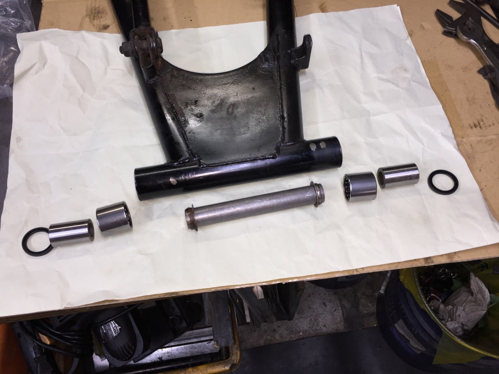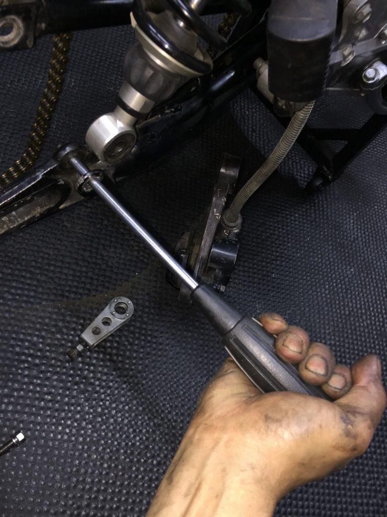 スイングアームを外して、ピボットベアリングを点検します。