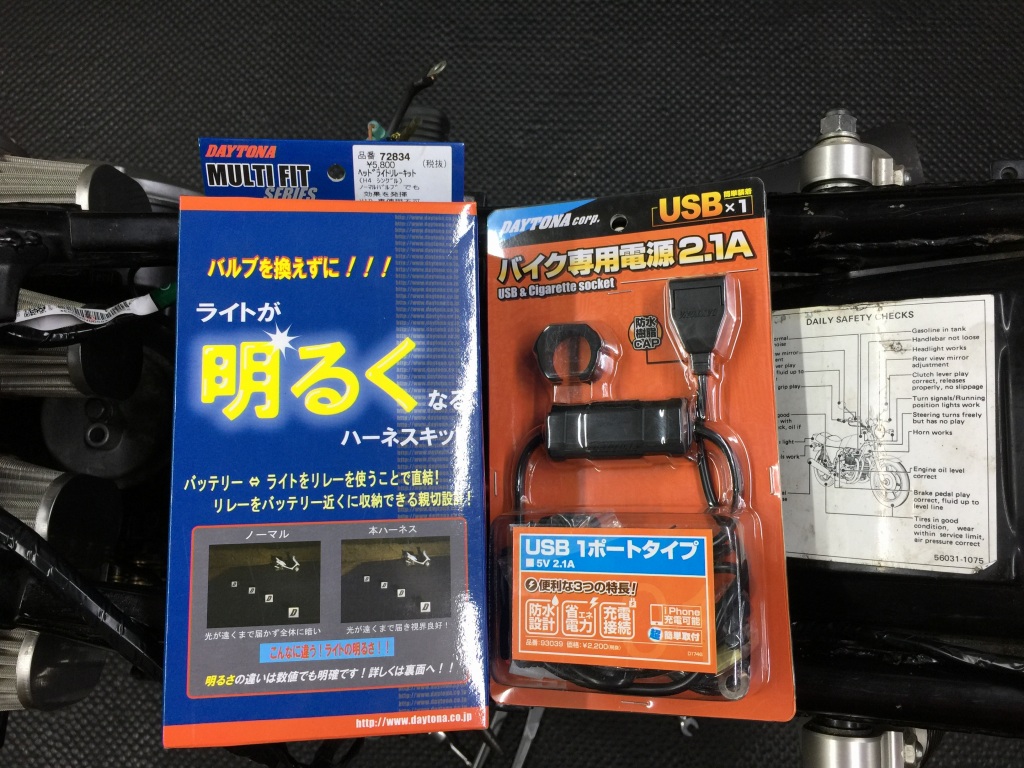 ヘッドライトリレーと、USB電源も装着します。