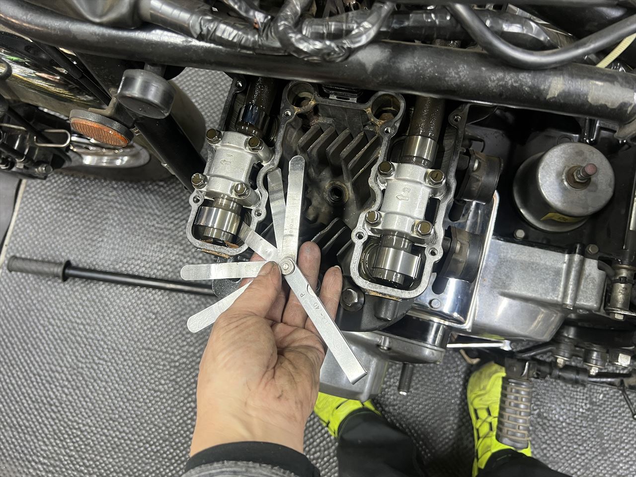 バルブクリアランスを計測します。やや広いところ、ややせまいところ、いろいろあります。