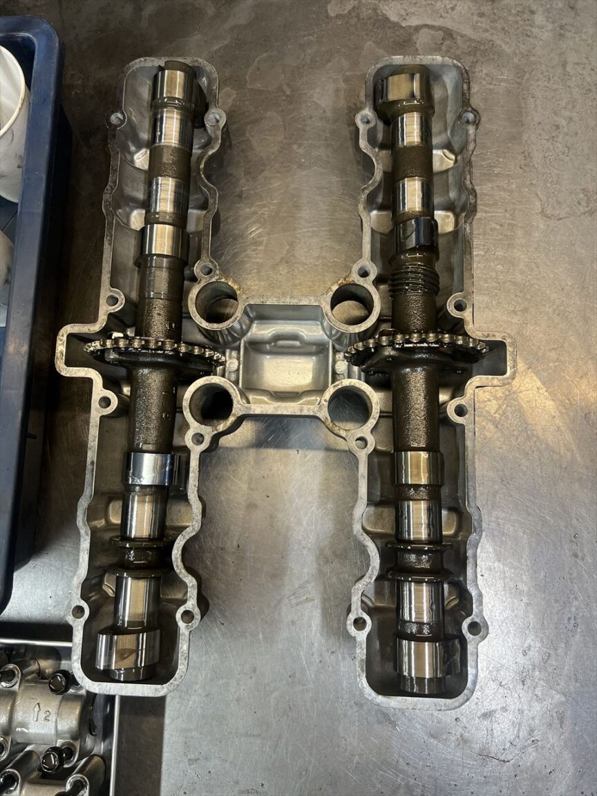 ヘッドカバーを外します。カムはノーマルですね。非常にキレイに当たりが付いています。