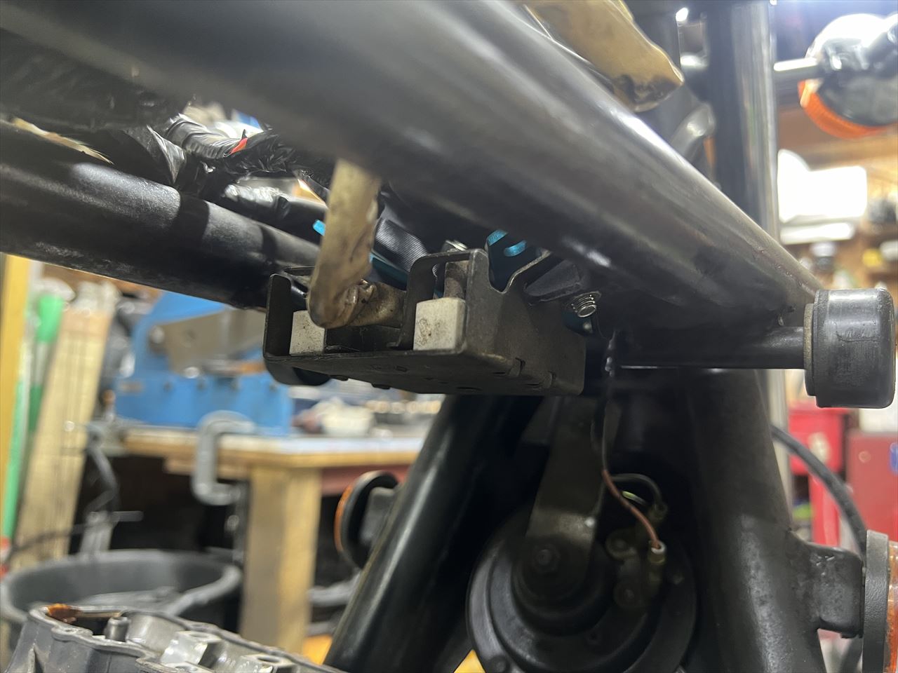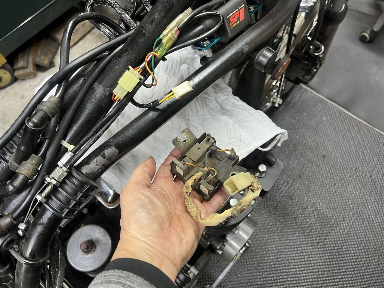 点火系はウオタニが入っていますが、ノーマルのコイル用抵抗が付いています。ヘッドを外す時に干渉するので外します。