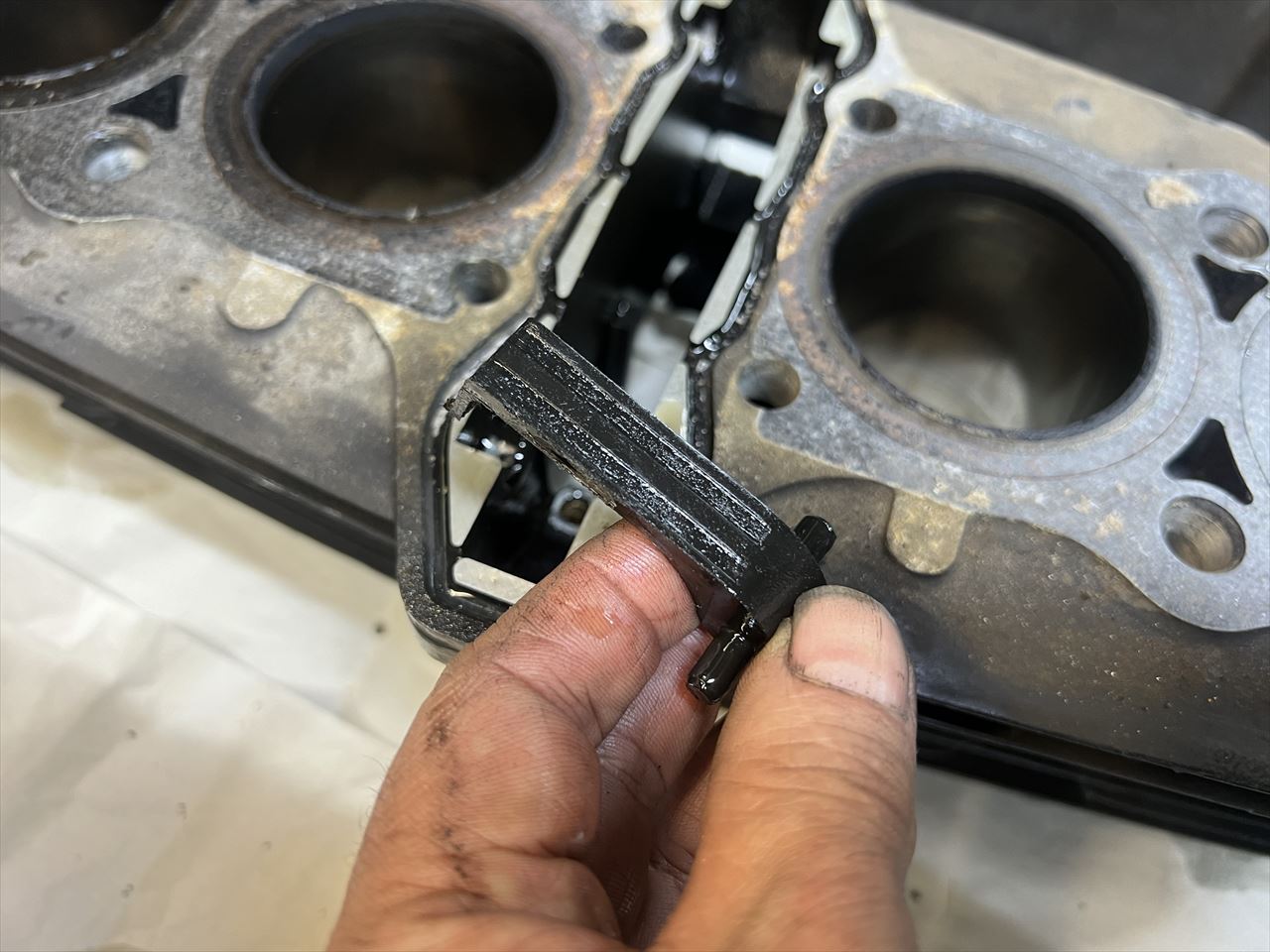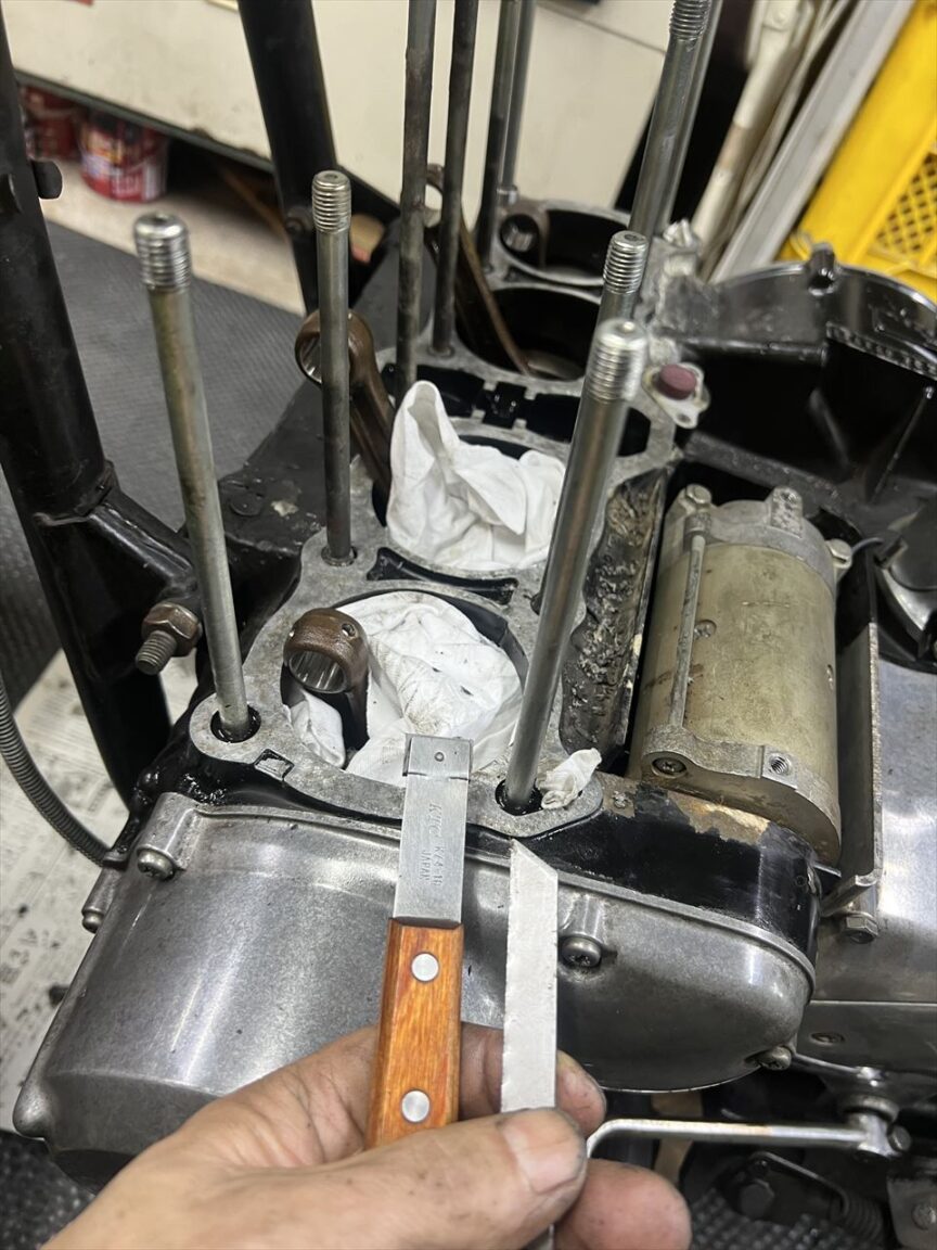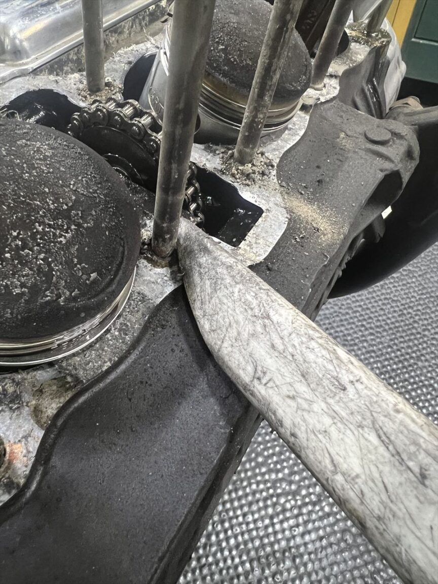 邪魔なシリンダースタッドがあり、ゴミを内部に落とさないようにやるのはなかなか大変な作業です。道具は主にセラミックのスクレッパーと小回りの利くノコ歯改造自作スクレッパーで行います。
