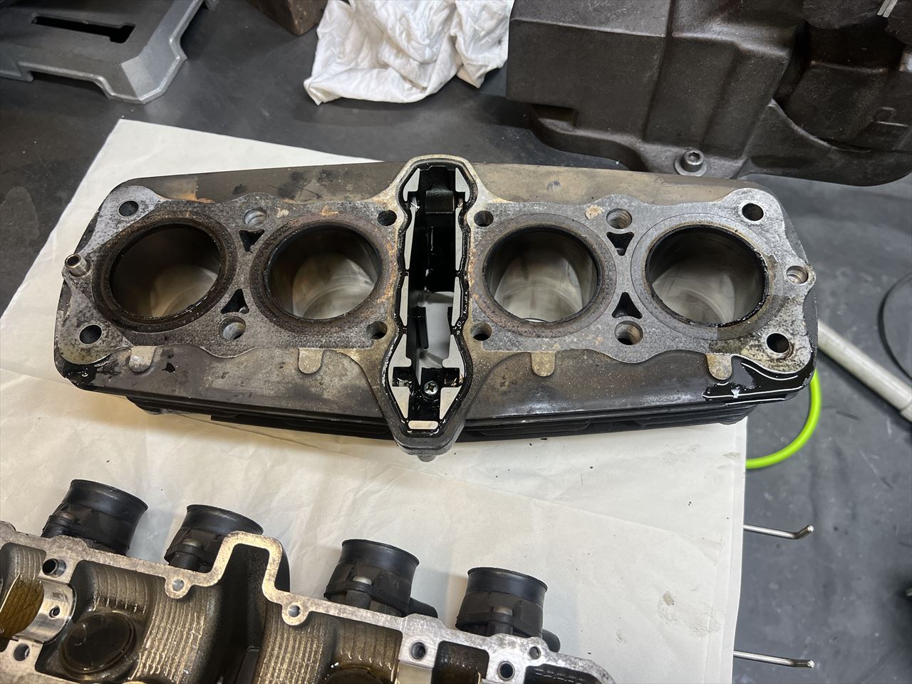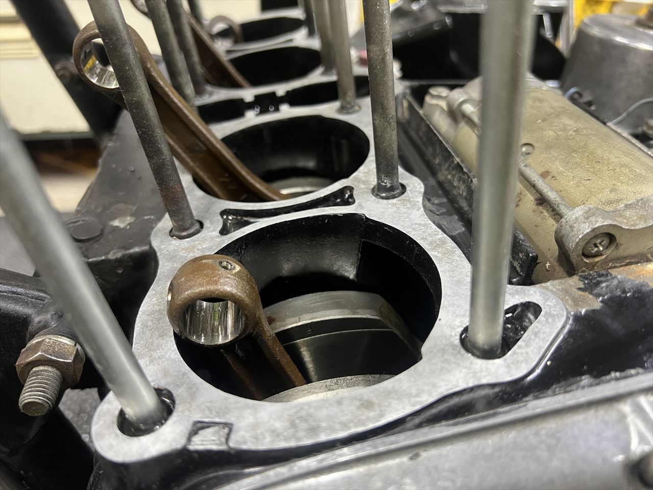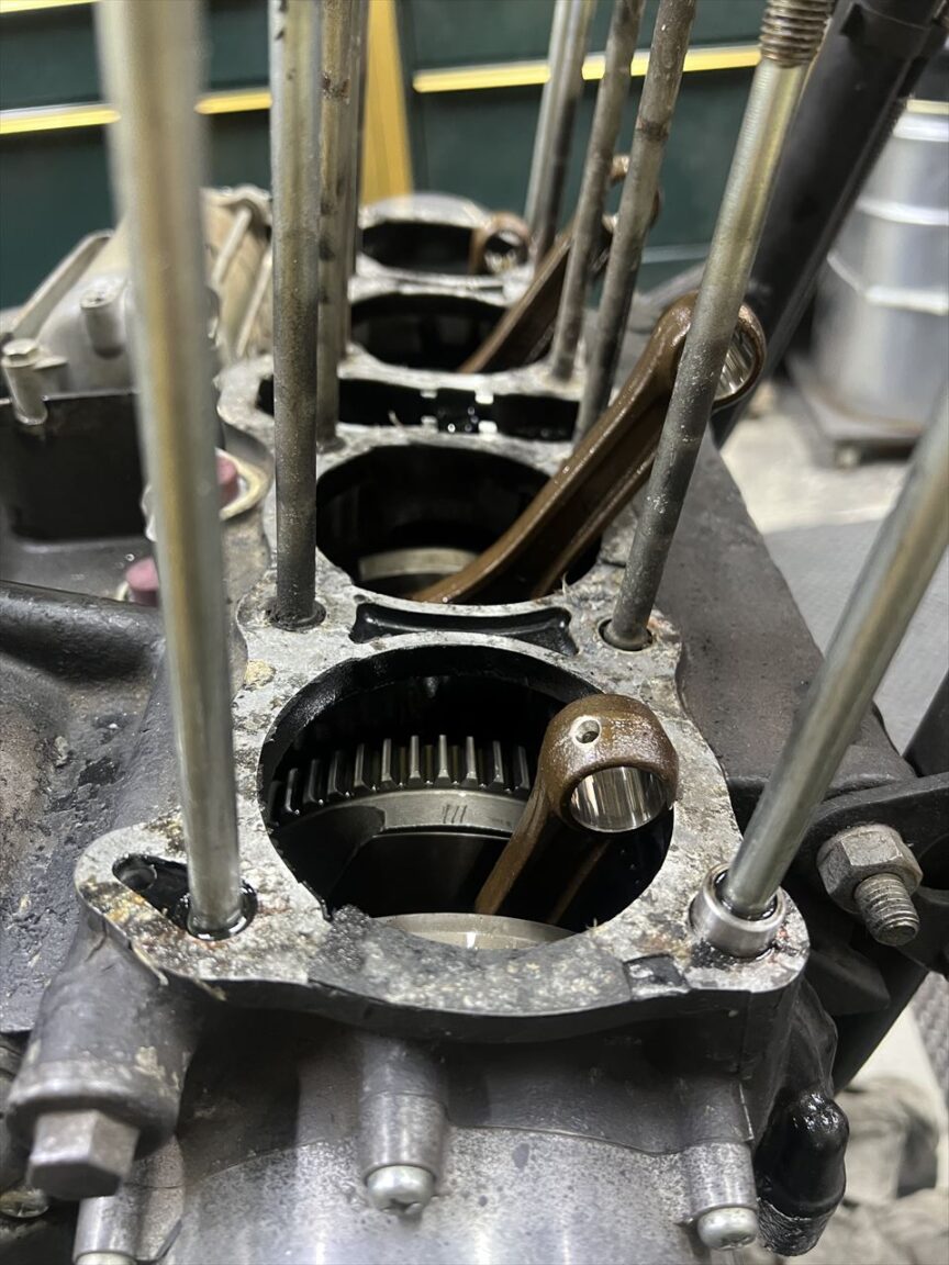 邪魔なシリンダースタッドがあり、ゴミを内部に落とさないようにやるのはなかなか大変な作業です。道具は主にセラミックのスクレッパーと小回りの利くノコ歯改造自作スクレッパーで行います。