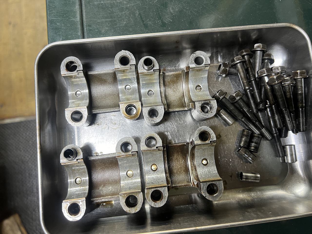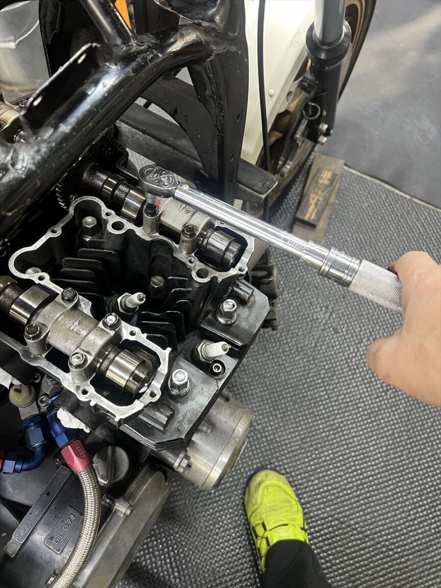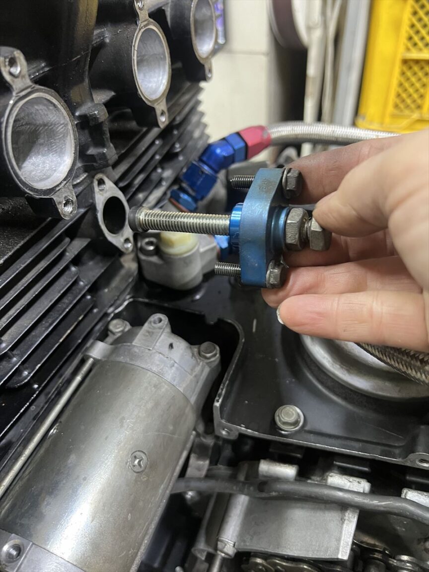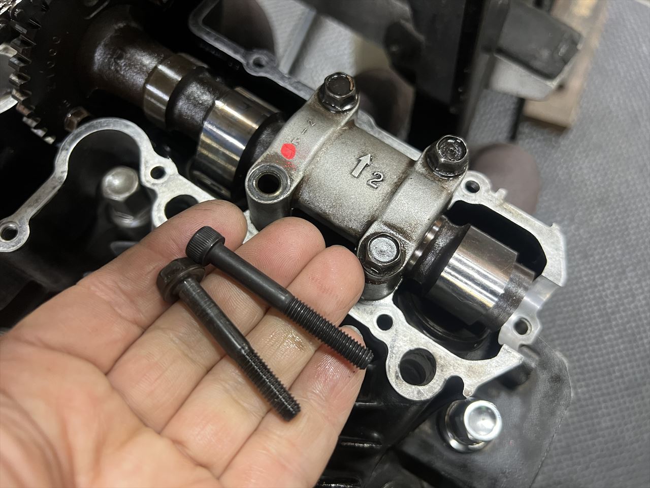 カムホルダーのボルトはノーマルで約42ミリですが、ヘッド側の雌ネジはもう少し深くまであるので、底付きしないギリギリの50ミリのボルトで試しましたがトルクは掛かりませんでした。緩めるときに抵抗が大きかったので、既にヘリサートが入れてあるようです。
