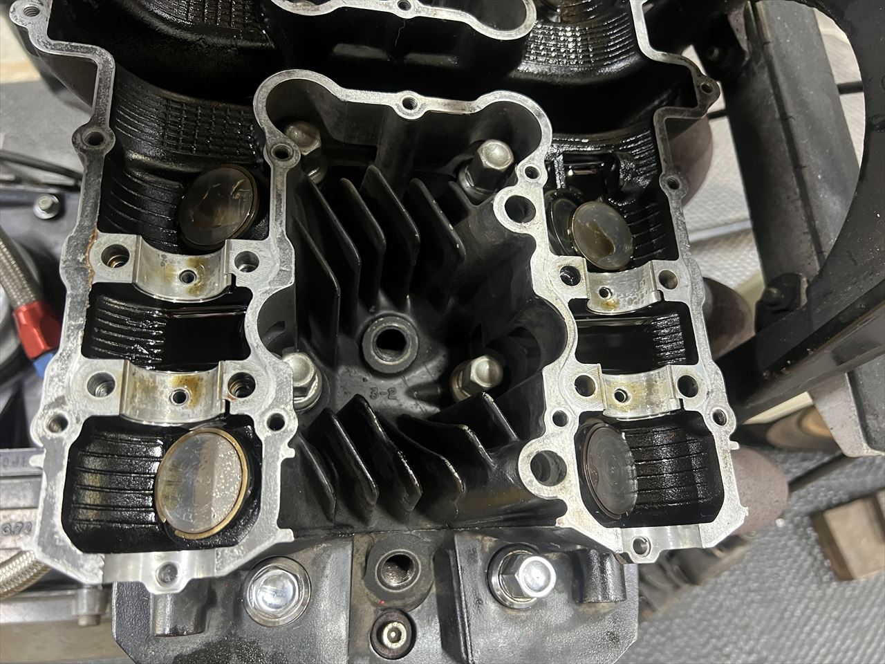 インテーク側8ヶ所は大丈夫でしたが、エキゾースト側は半回転ほど増し締めできてしまいます。これは雌ネジが傷んできているサインです。赤くマークしたところ1ヵ所はトルクがかからないので要修理です。
