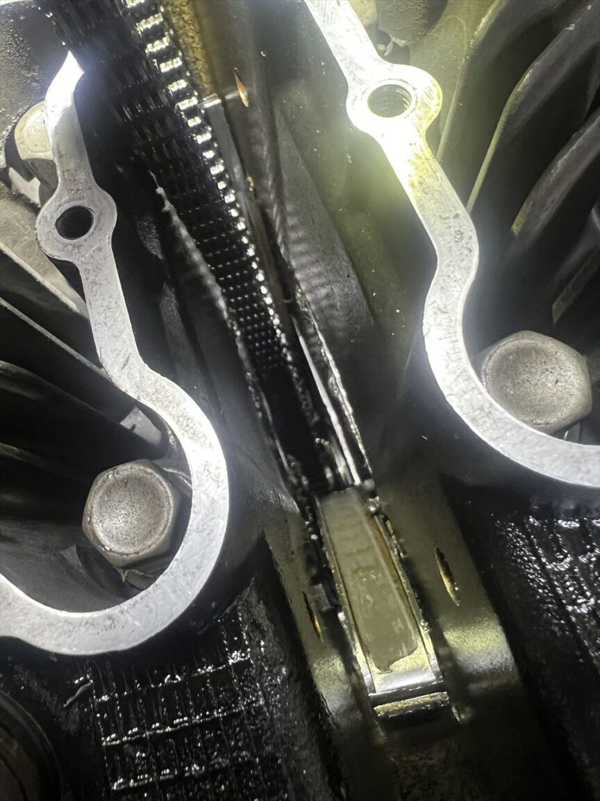 カムチェーントンネル内はこんな感じ。カムチェーンの背面は画像では分かりづらいですがテカテカ光るほど摩耗しています。