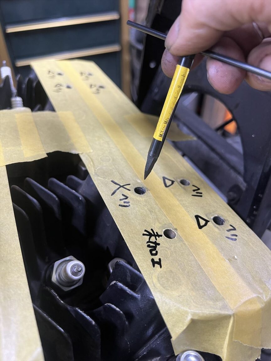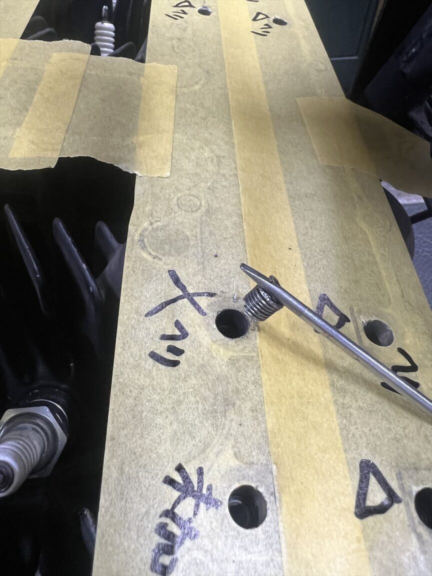 今より深いところに新しい2D長さのヘリサートを設置してみます。ネジ穴の底までヘリサートタップを立てます。はたしてこれでトルクは復活できるでしょうか。車載で修理するのもスペース的に効率が悪いので、場合によってはヘッドを外しての修理、更にヘッド交換も想定しなければいけないでしょう。