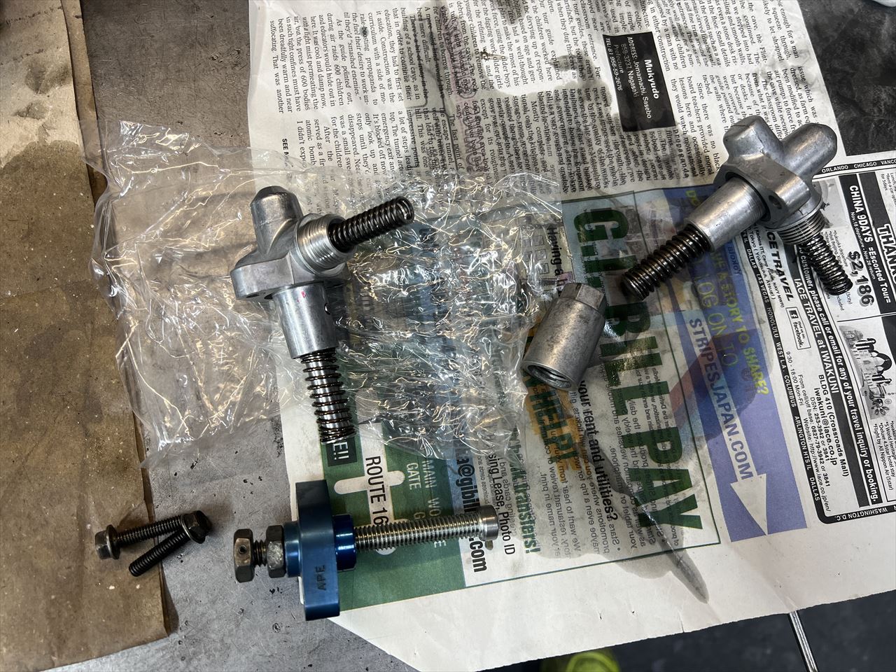 カムチェーンガイドが新品に交換できたので、テンショナーは迷わず純正新品のオートタイプを使います。キャップ部分は生産終了しているので、手持ちの中古品から部品取りして使います。