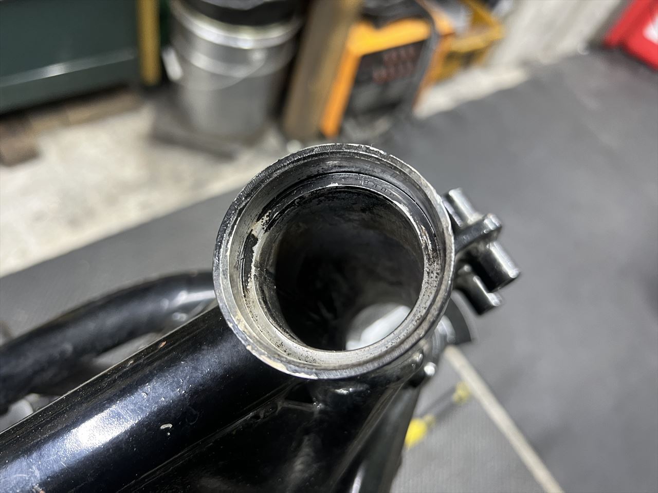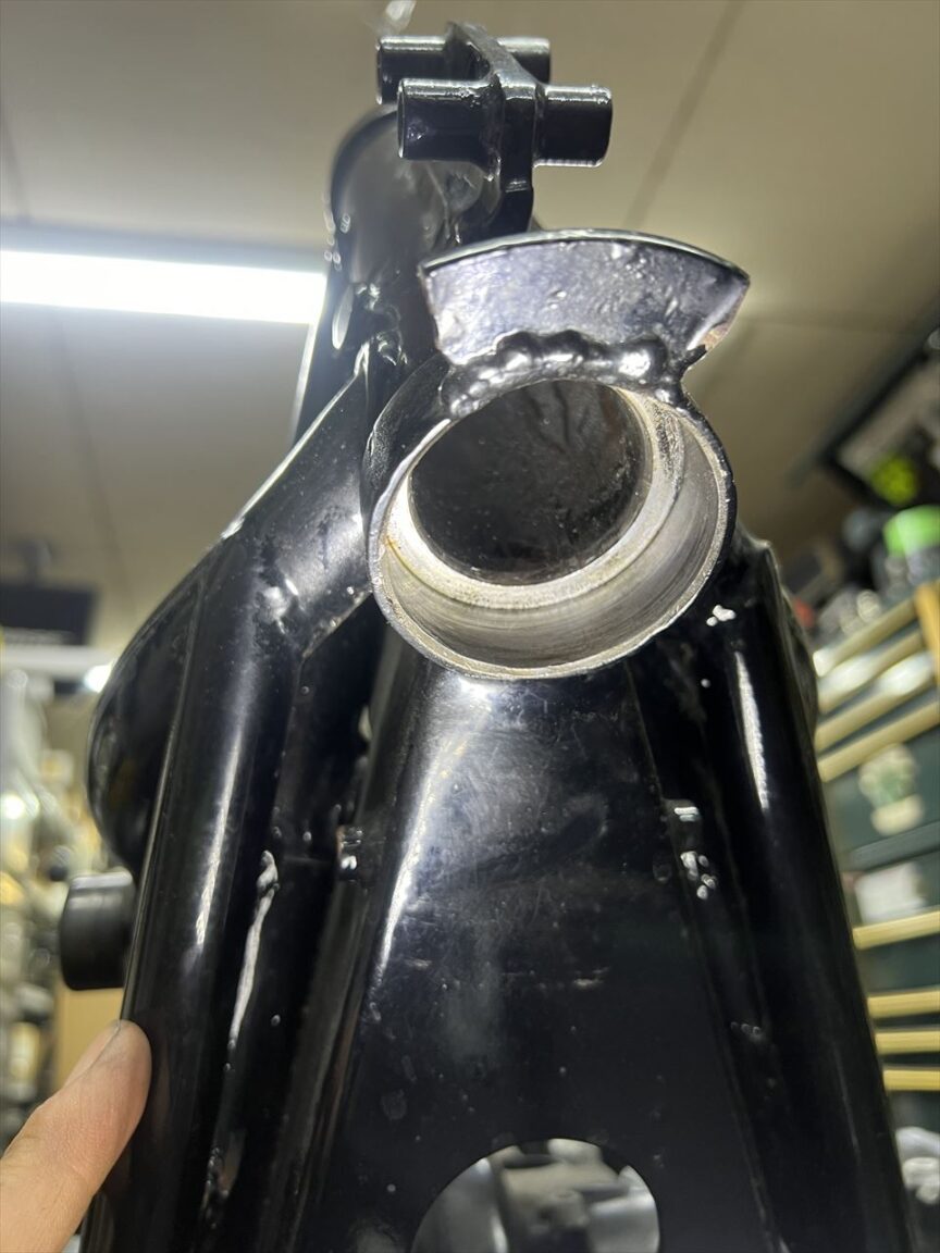 ロアー側はノーマルレースを抜く際に付けたと思われる傷があり、後付けのハンドルストッパーの溶接のせいで、口元に少し変形がありますが、奥の方は大丈夫のようです。