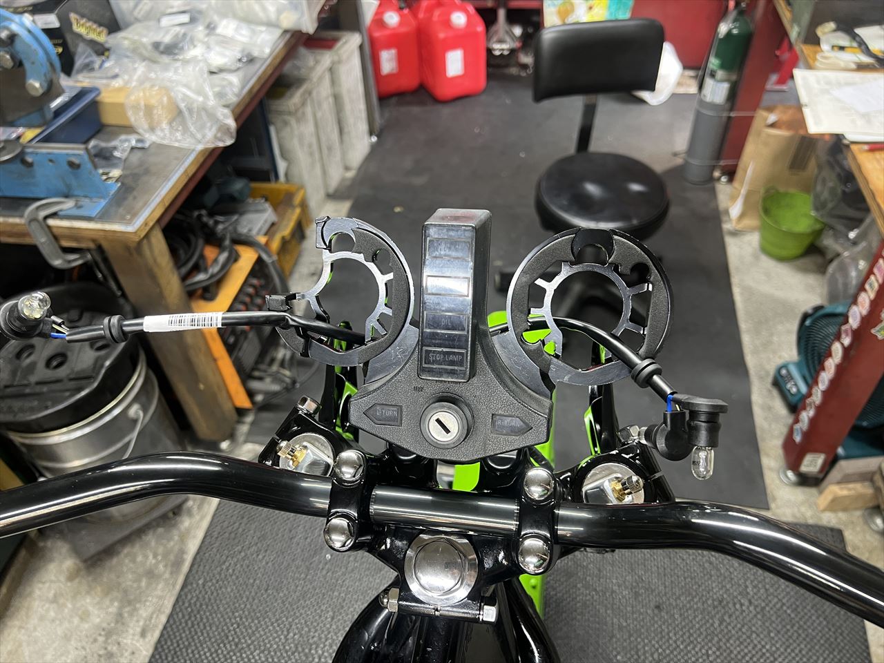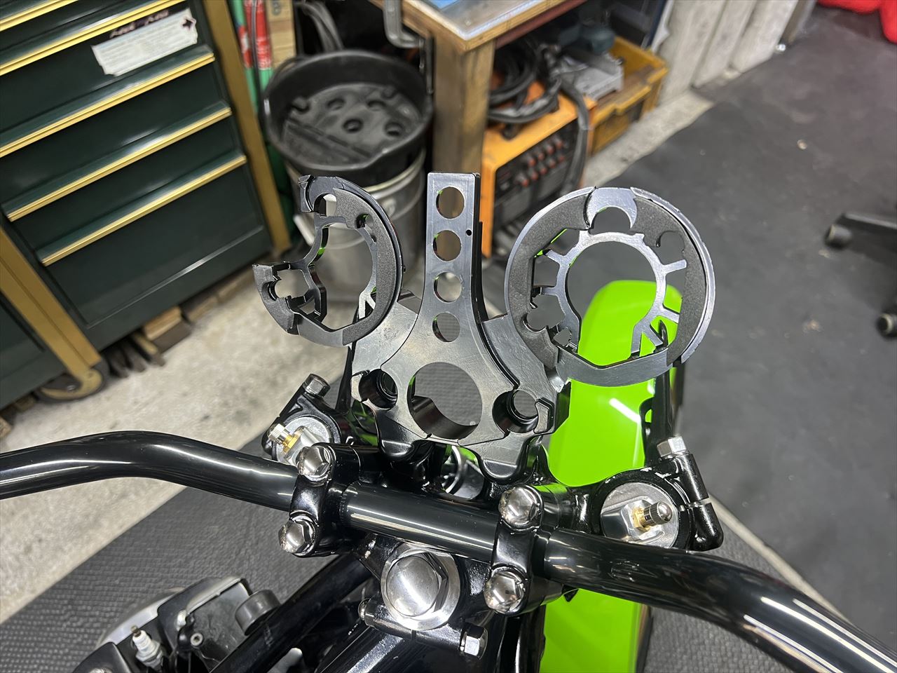 既存のメーターブラケットは、マウント部分の下側が削られています。組み合わせていた社外のステムに干渉するので逃げを作ったようです。
