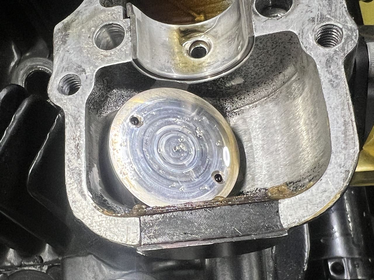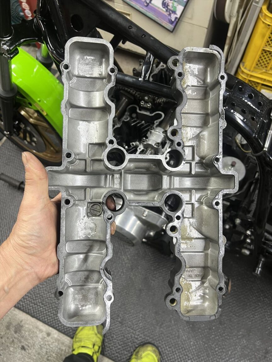 ハイカムのカム山の逃げとして、内側の十字型出っ張りが削られていますね。このカバーは2次空気導入の出っ張りをカットしてありましたが、その内側にはパテがもってあります。ここは貫通してオイル漏れしたのでしょうか。