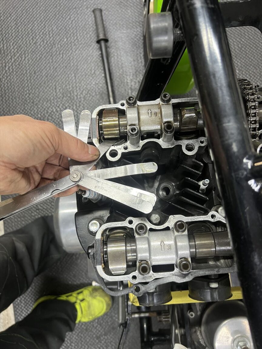 バルブクリアランスを計測します。0.12~0.16ミリなので、ハイカムとしてはやや狭い感じ。