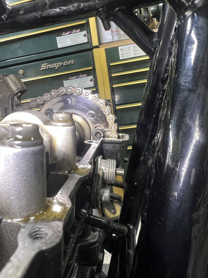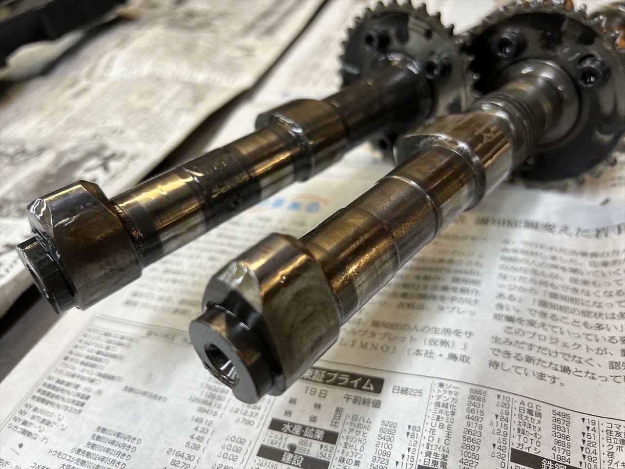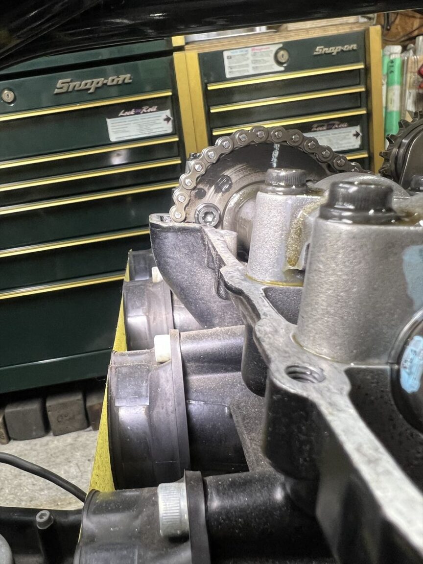 カムスプロケはノーマル加工品のようで、ダンパーゴムを削り、ボルト穴を長穴にしてあるようです。エキゾーストカムの矢印マークは半コマ分ほど上に来ているので、面研が多いかカムチェーンが伸びているか、その両方かもしれません。