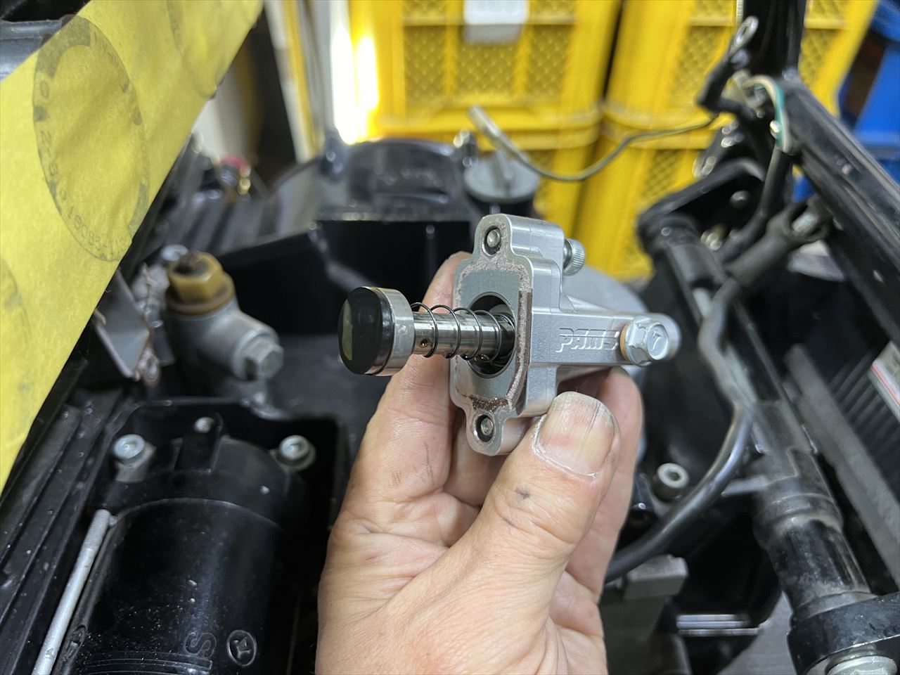 カムチェーンテンショナーを外します。PAMS製のオートタイプが使われています。