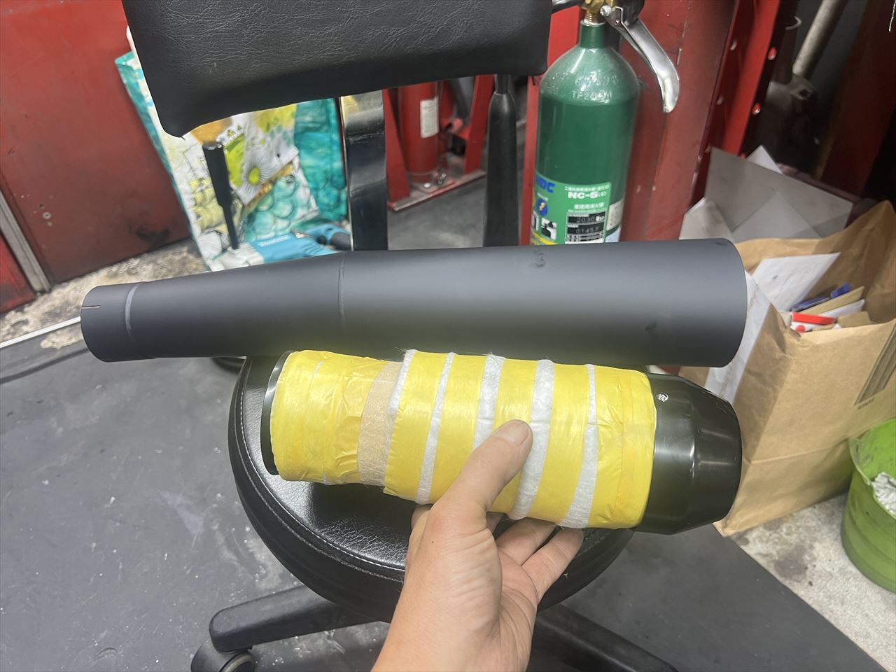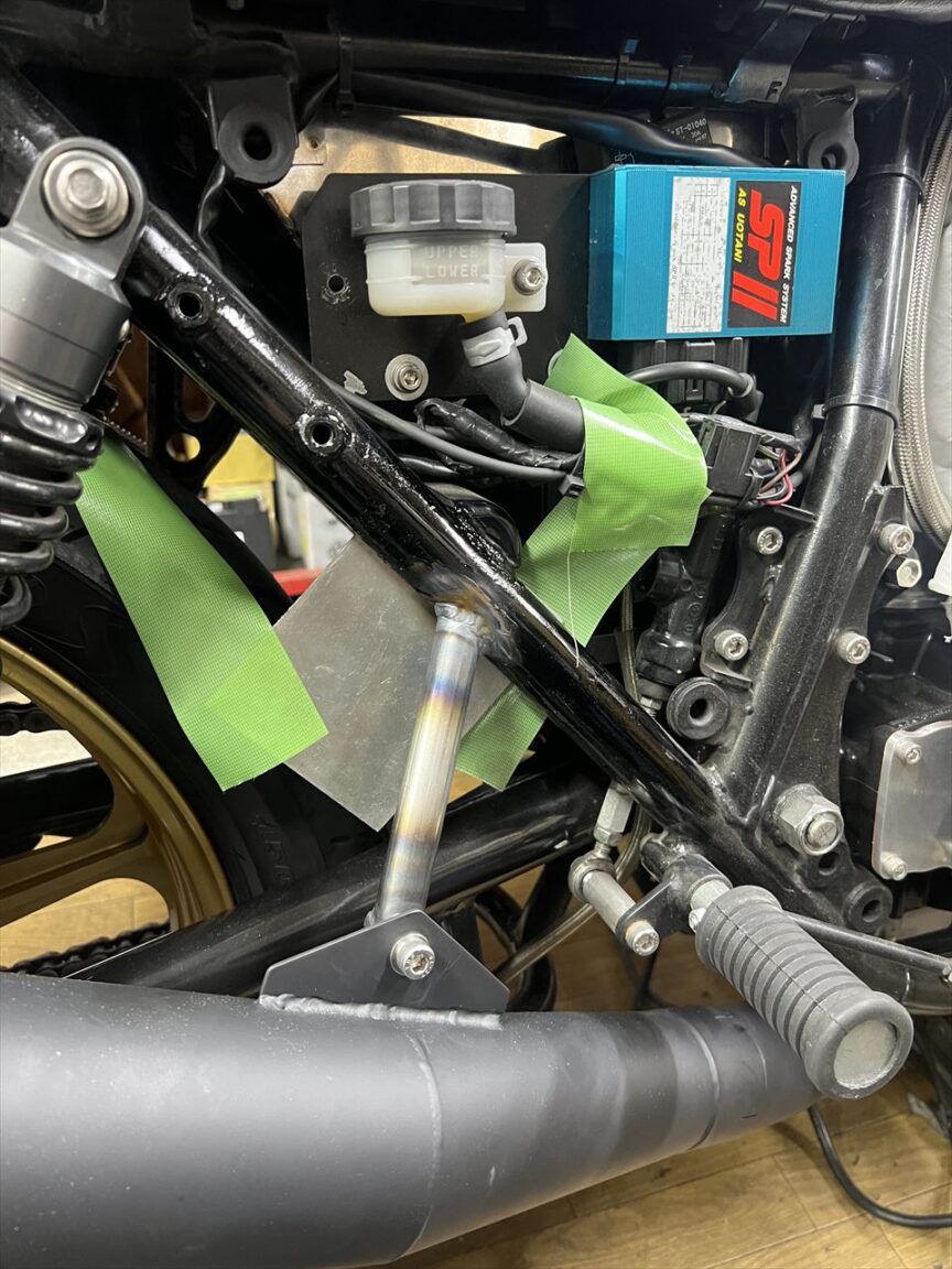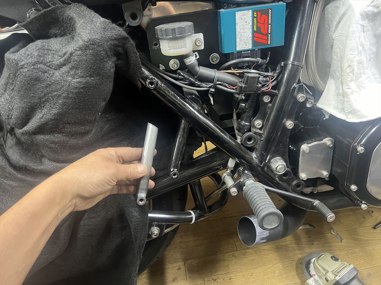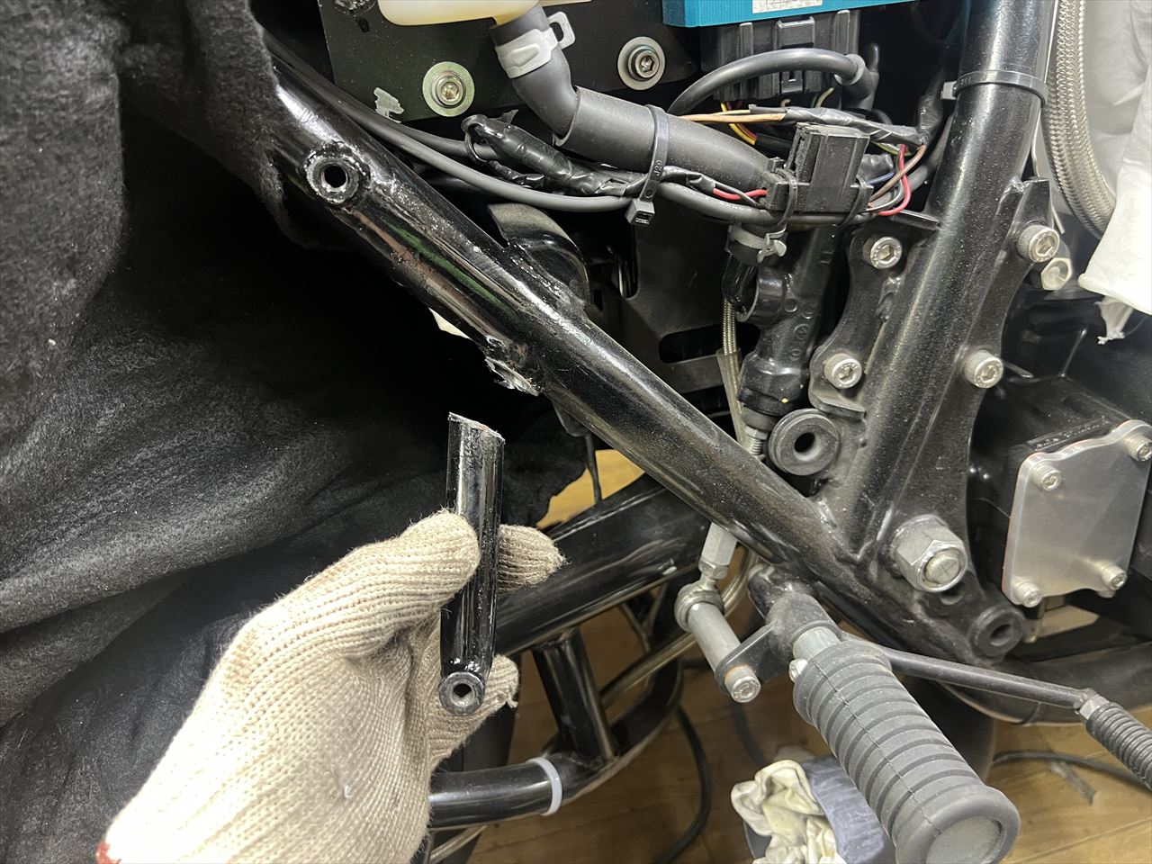 新しいマフラーを仮付けし、フレームに合わせてステーの長さを調整、接続面を擦り合わせます。