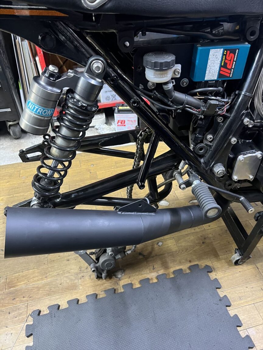 先日のエンジンオーバーホールの際にマフラーも交換することになり、BL-FACTORY製の新品を塗装に出していました。それが完成したので取り付けます。先ずは既存のKERKERを取り外します。