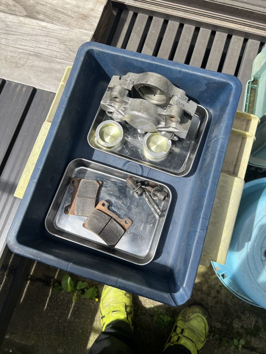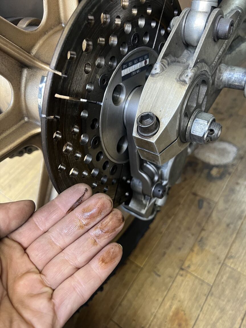 キャリパーを触ると液体が付いています。フルードが漏れているようです。