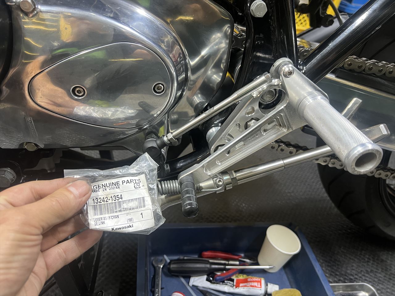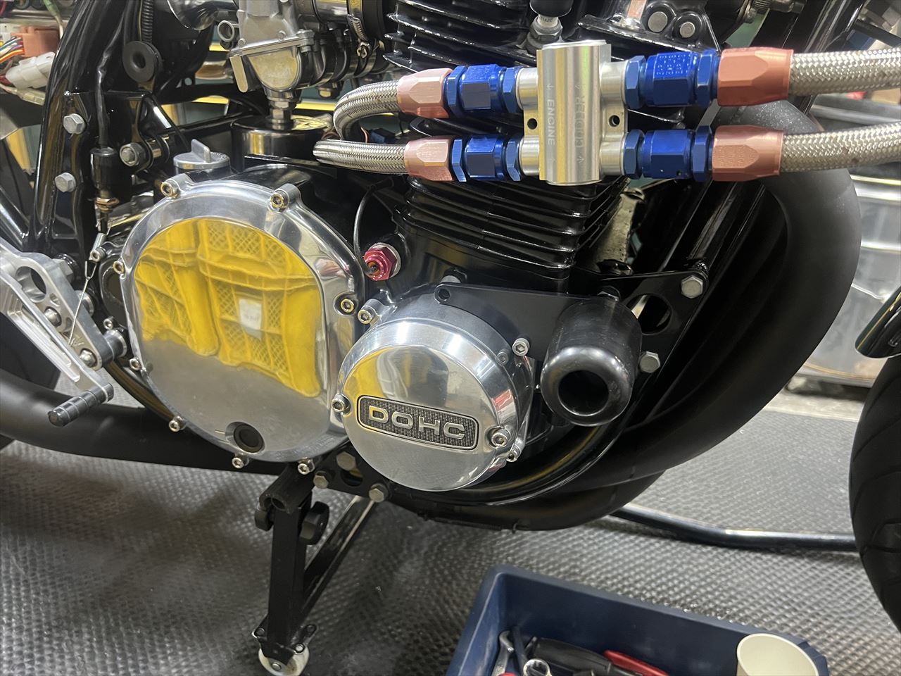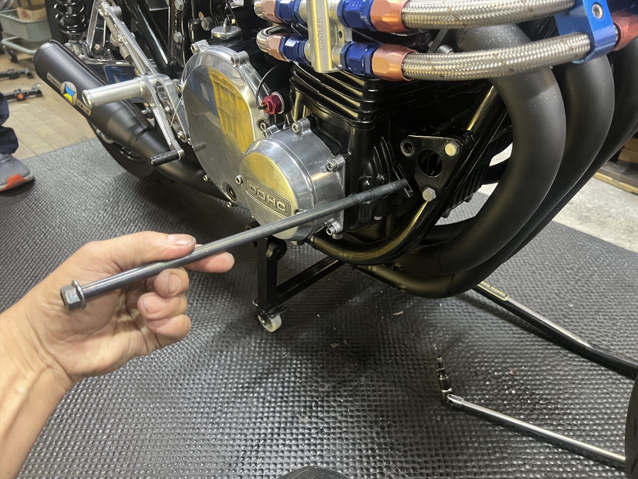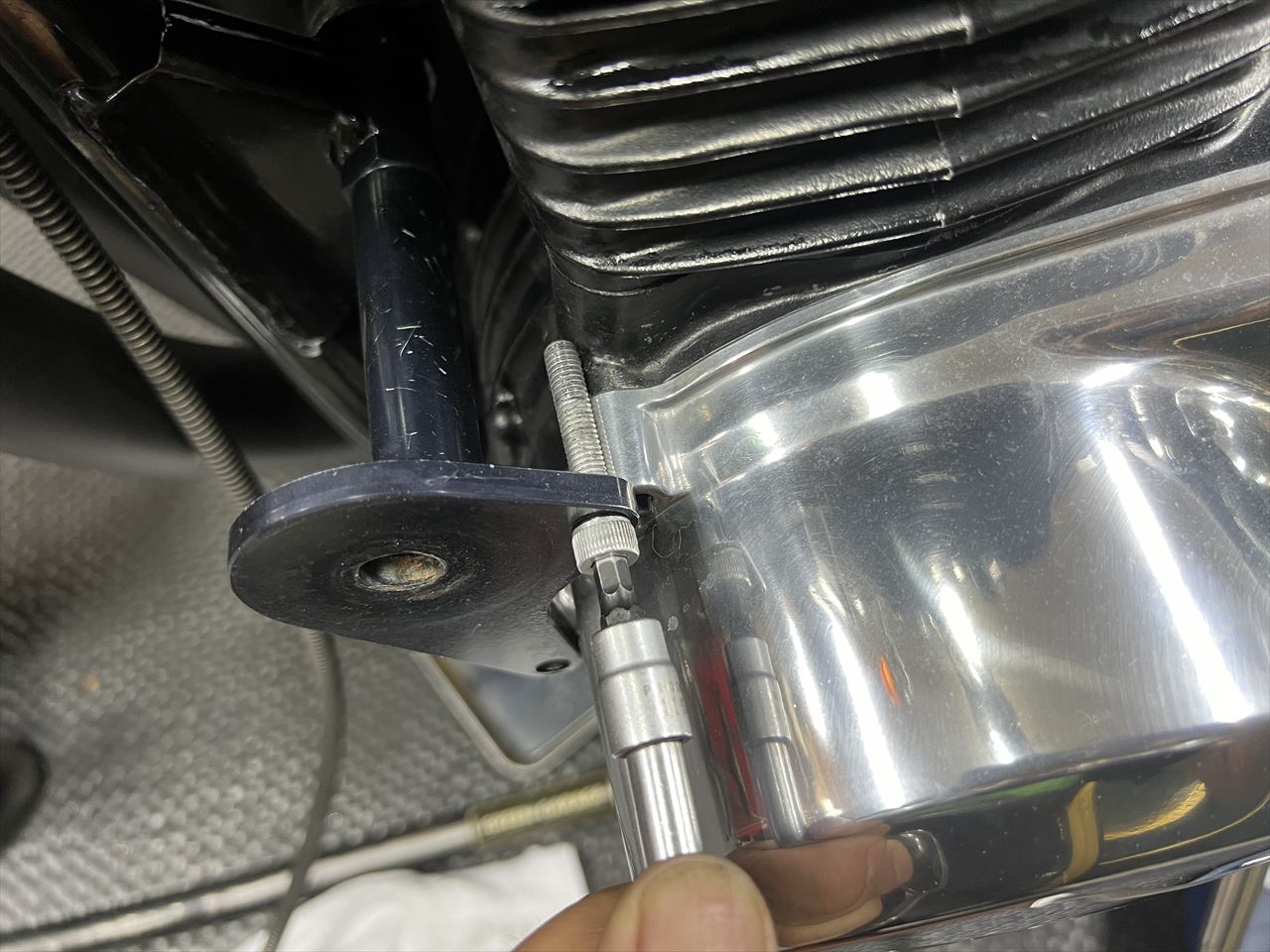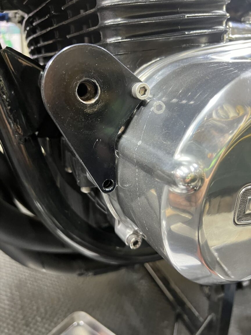 エンジンスライダーは廃止し、1000Jの純正マウントボルトを使用して取り付けます。なんとか日帰りで作業終了しました。