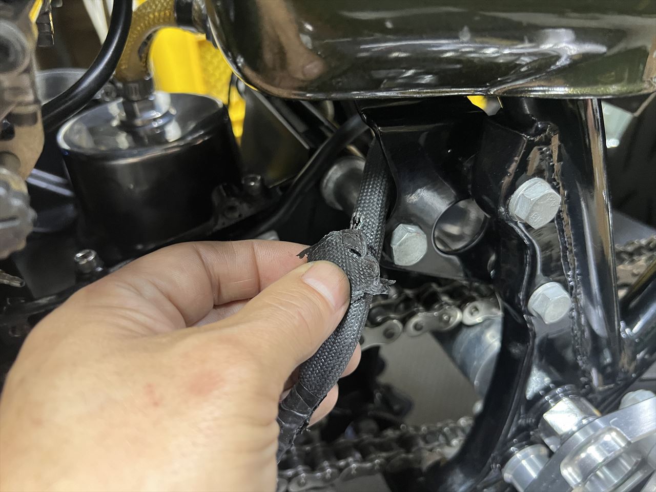 スプロケカバーを外します。ジェネレーターハーネスのカバーが切れていました。ここはカバーを取り付ける際に挟み込み易いので要注意ヶ所です。