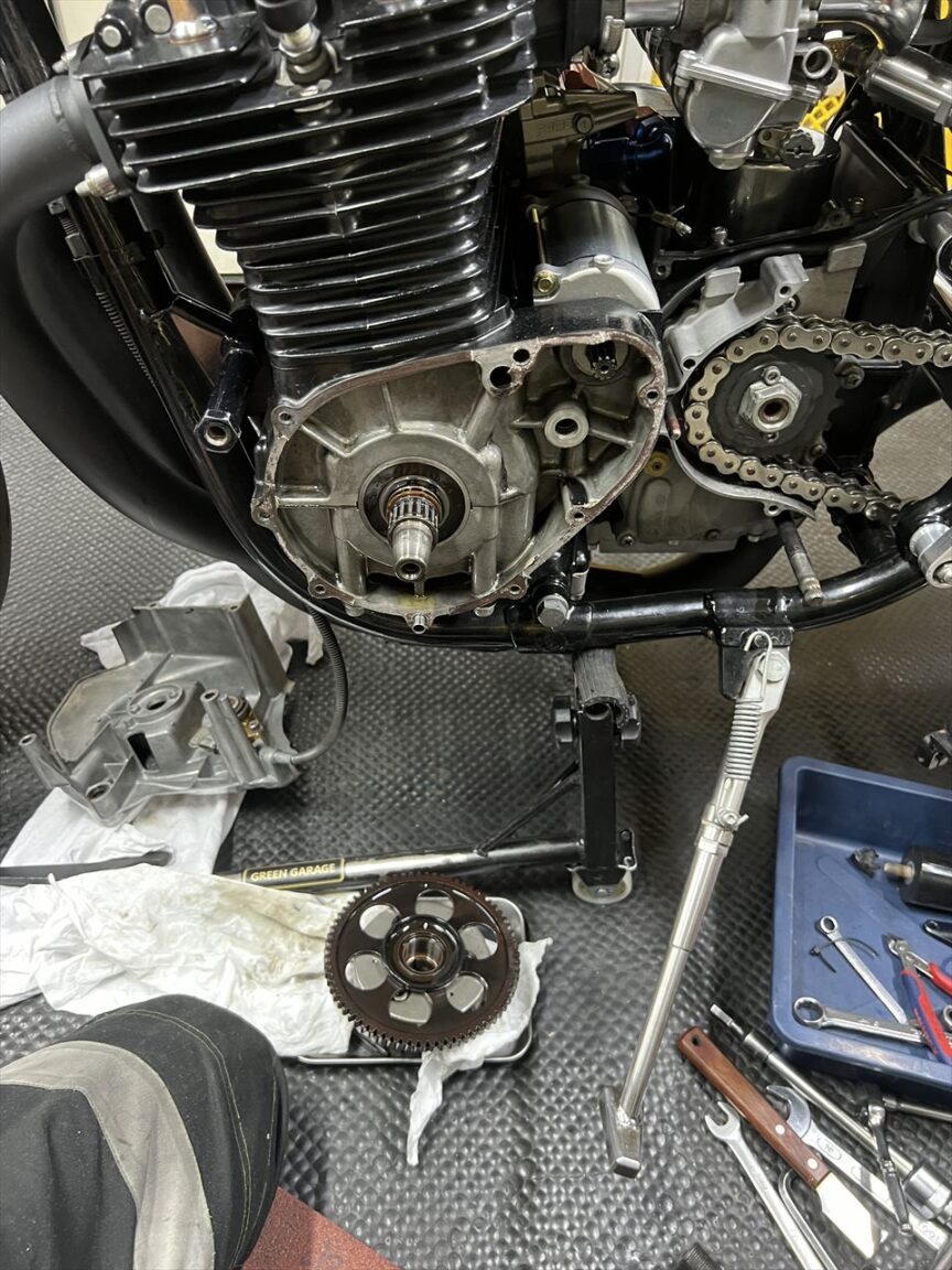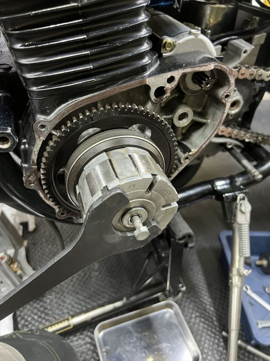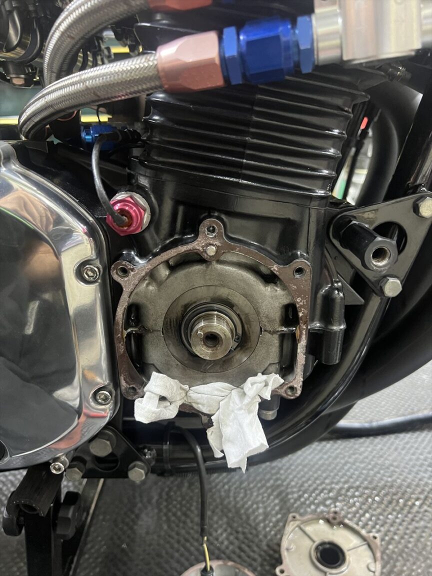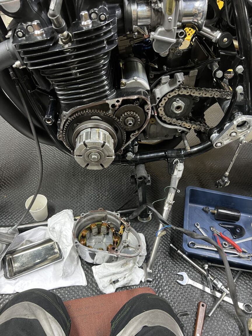 ジェネレーターカバーを外します。スタータークラッチのボルト緩みやローターボルトの緩みを想定していましたが、その辺りは大丈夫そう。