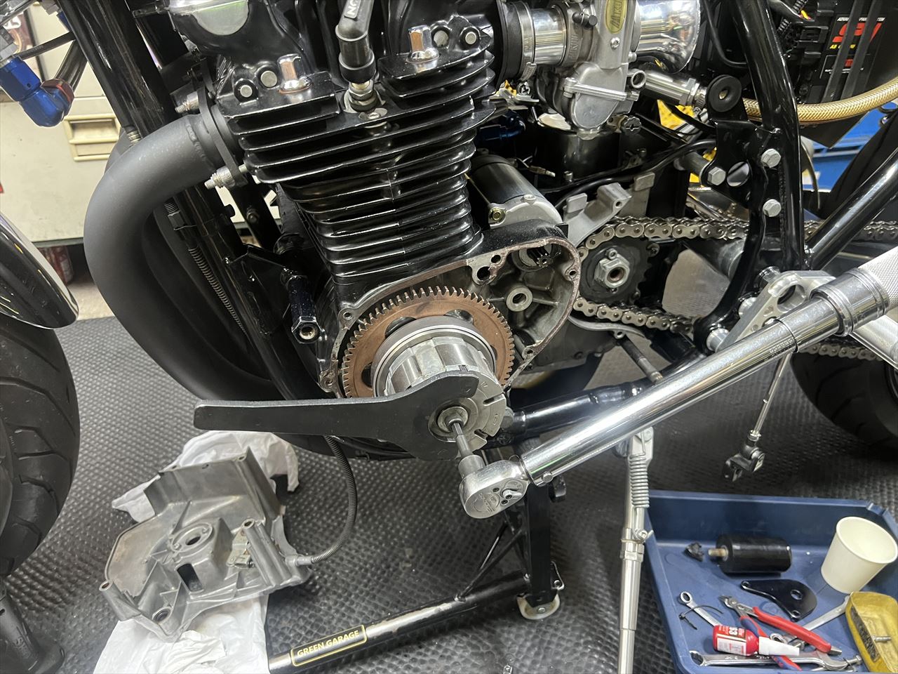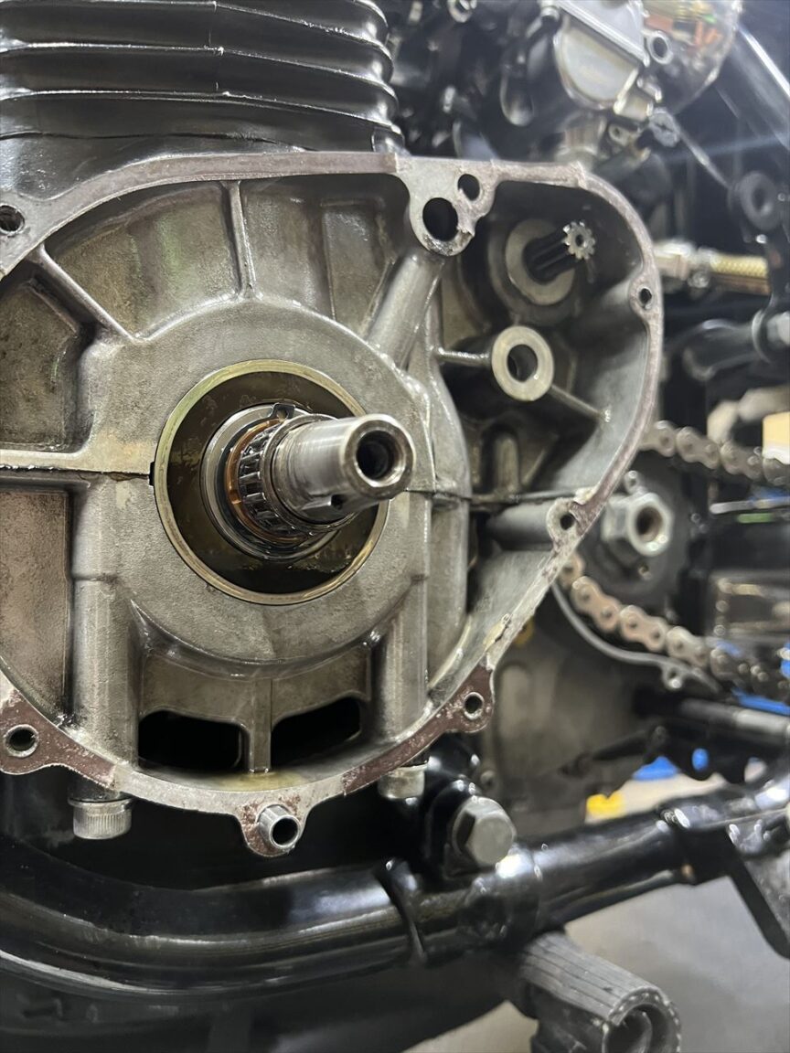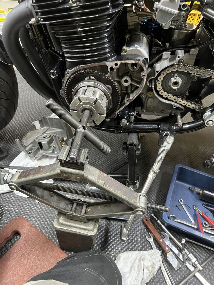 ジェネレーターカバーを外します。スタータークラッチのボルト緩みやローターボルトの緩みを想定していましたが、その辺りは大丈夫そう。