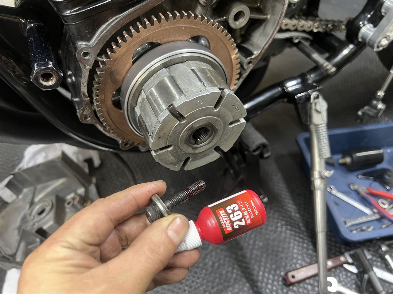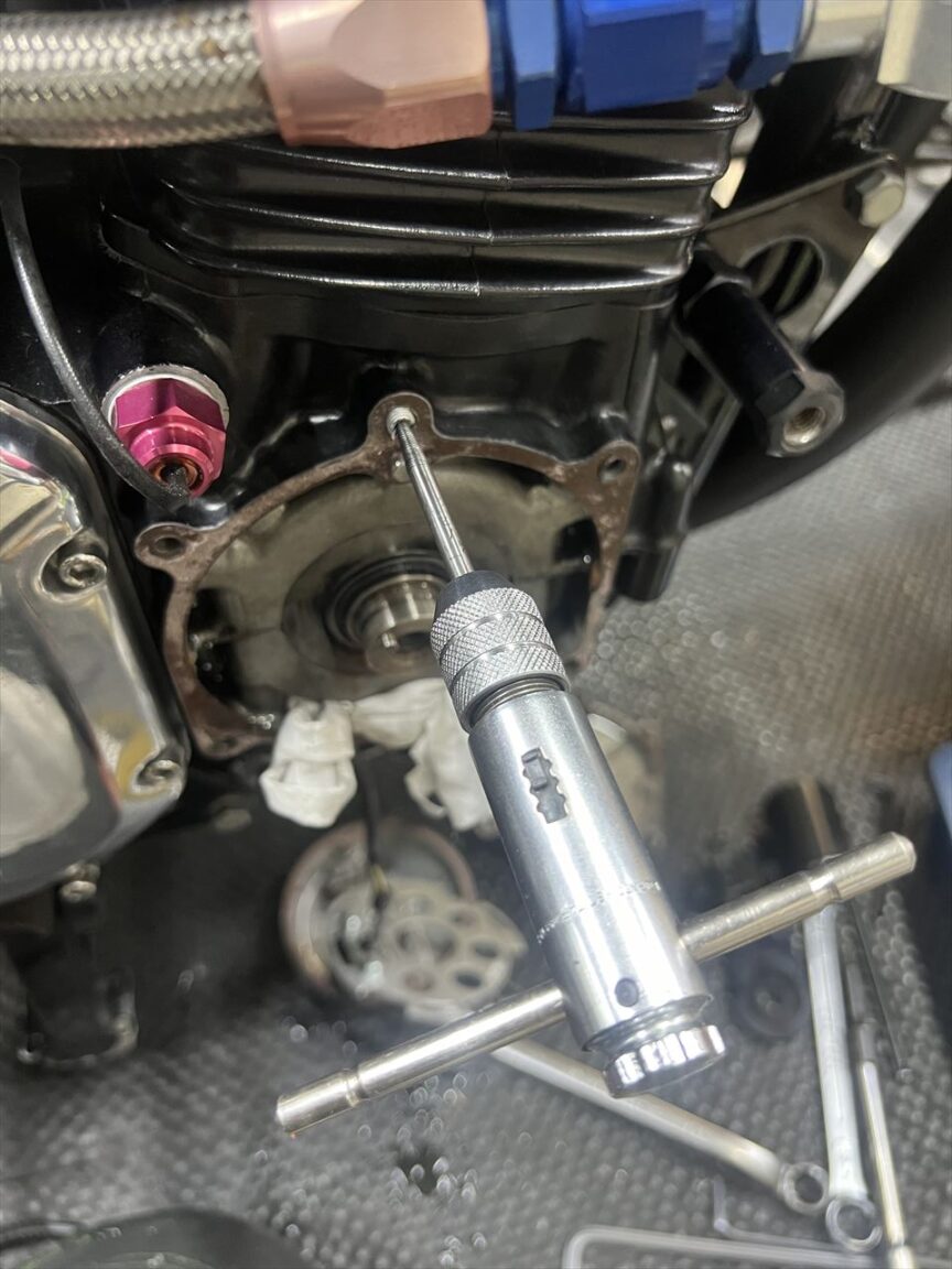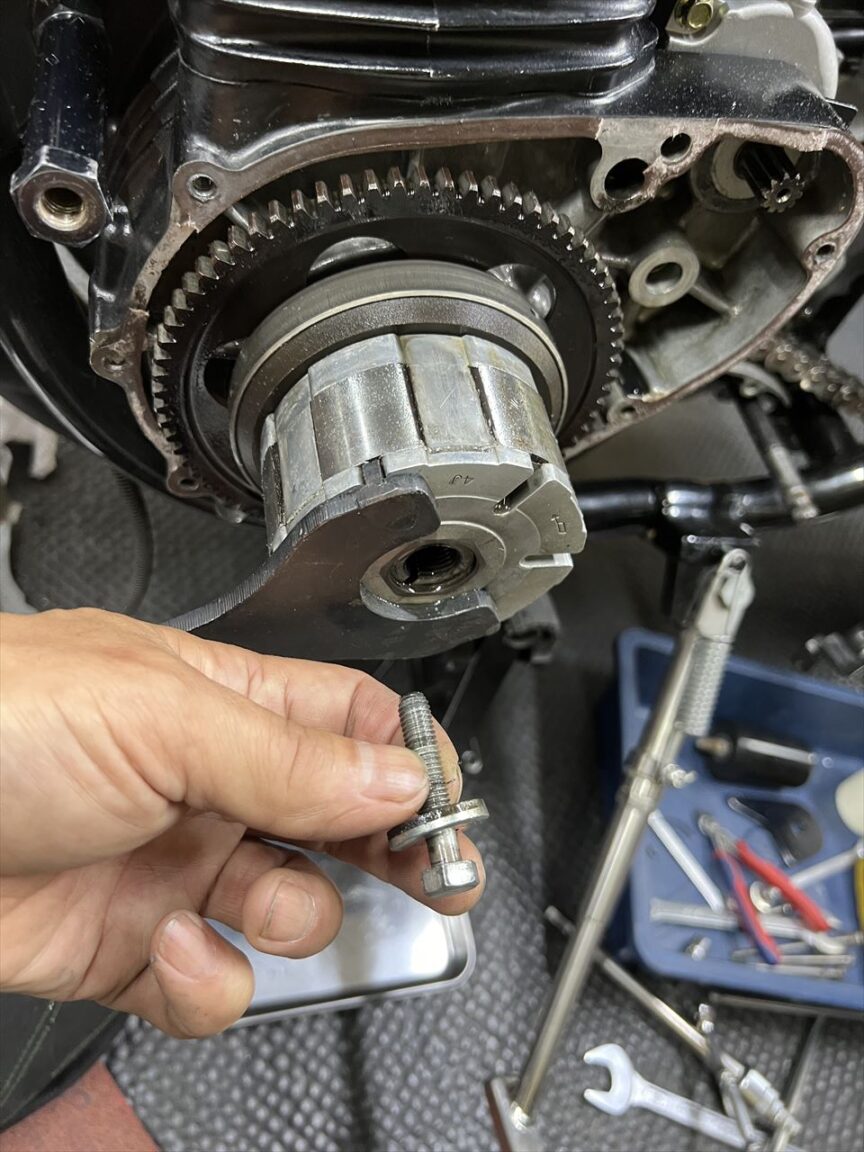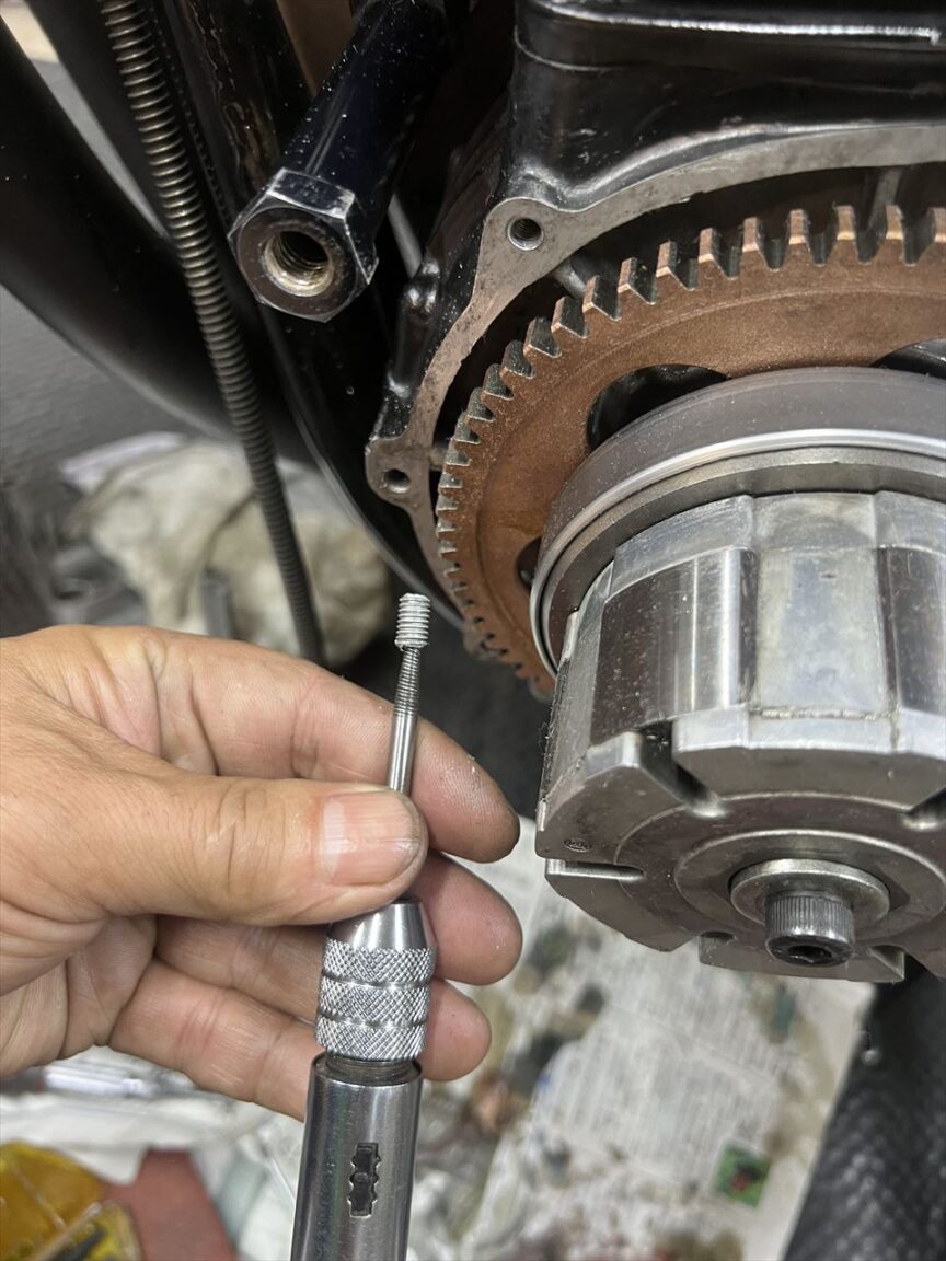 M8ボルトの標準的なトルクは2kg・mくらいですが、ここはそれでは確実に緩みます。必ず指定のボルト以上でマニュアルのトルク値で締めましょう。ここが緩んでスタータークラッチが空回りしたり、ボルトが折損している車両は結構見かけます。