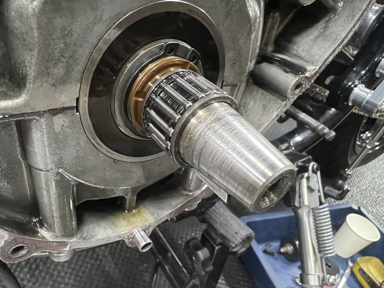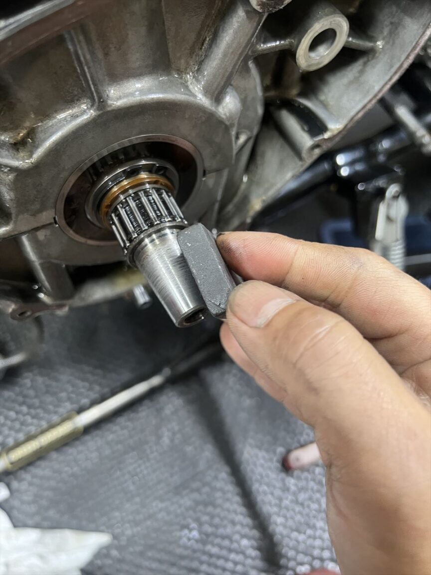 クランクのテーパーは、凸部分をオイルストーンで修正しておきます。ここはなかなか再研磨するわけにもいかず、修理の場合はクランク交換になるので整備は重要な個所です。