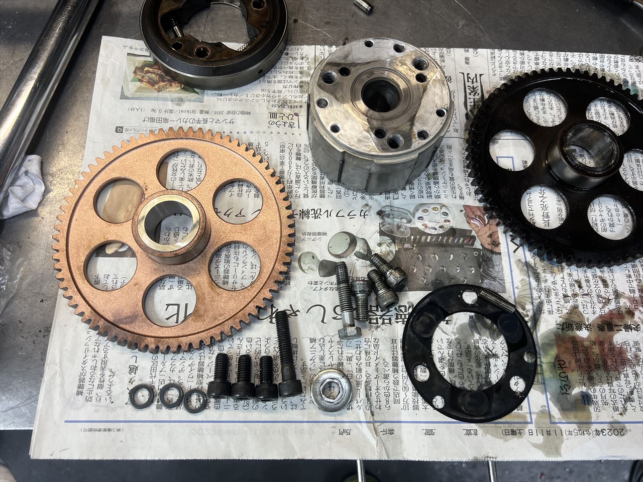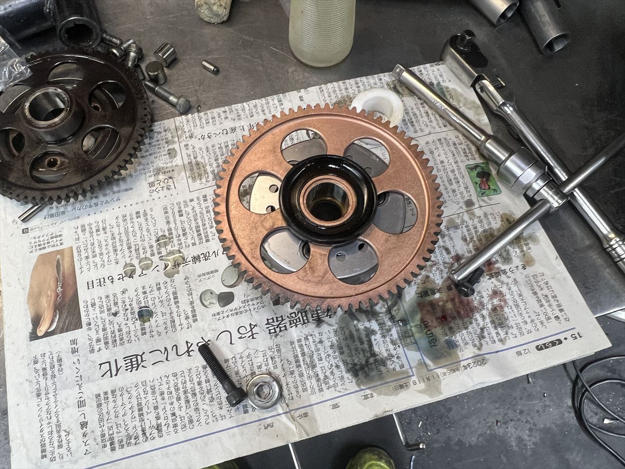 スタータークラッチはローラーの圧痕があり、替え時だったようです。ギヤとワンウェイの両方を純正新品に交換します。