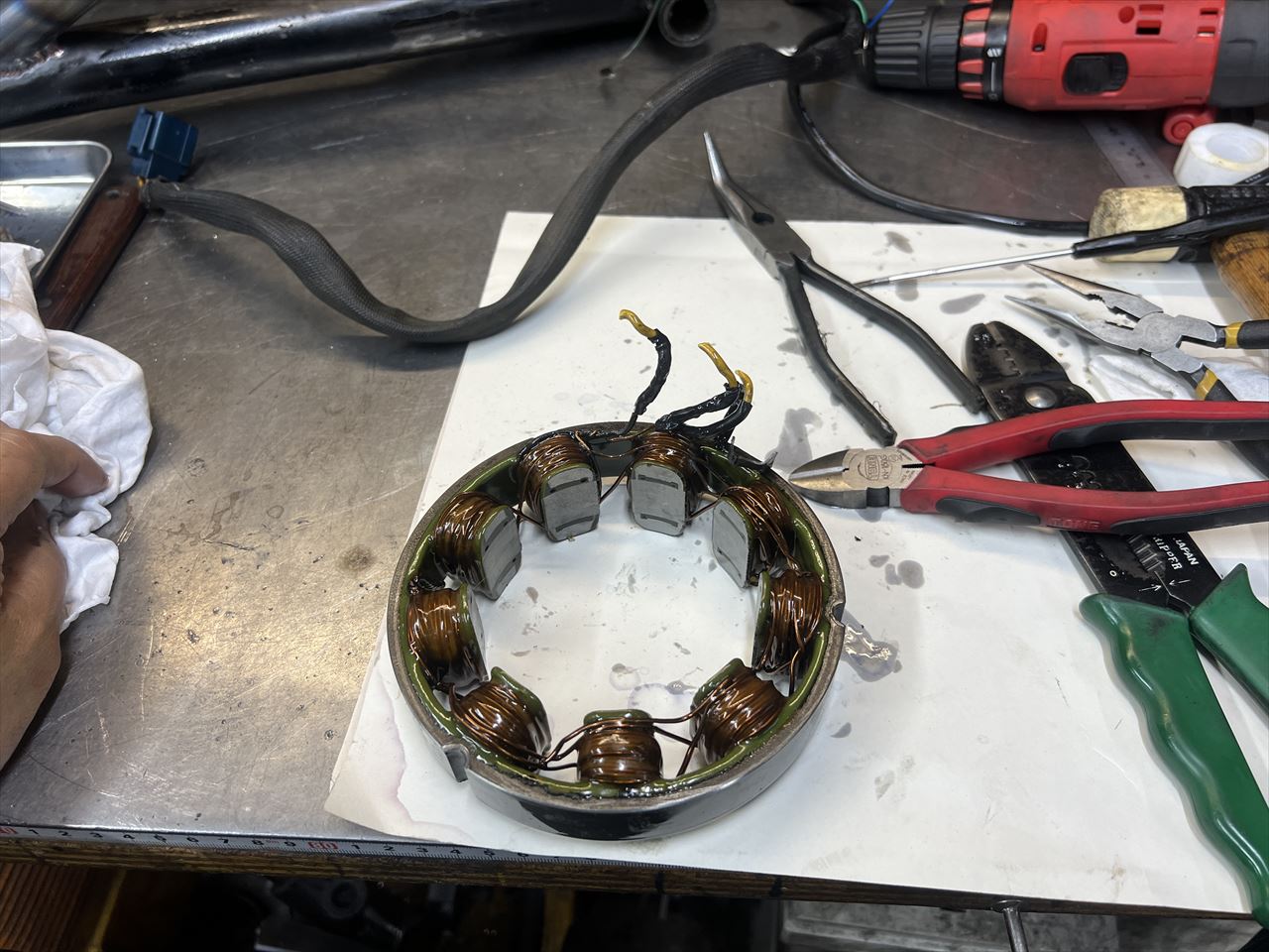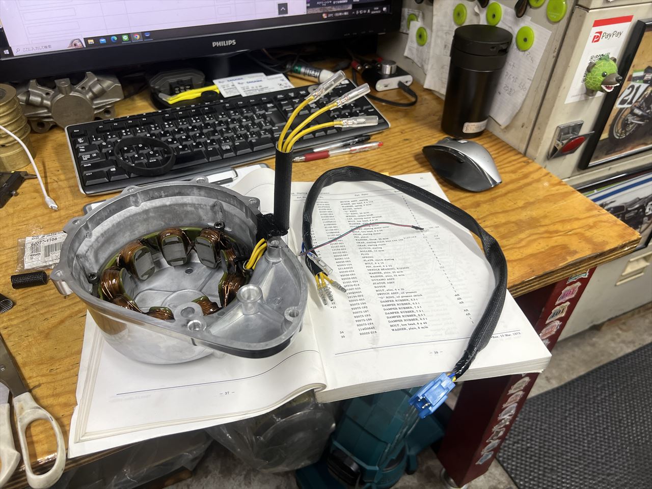 ジェネレーターカバーにキズがあるのでカバーも交換します。ステーターコイルの配線もかなり硬化していたので合わせて交換します。