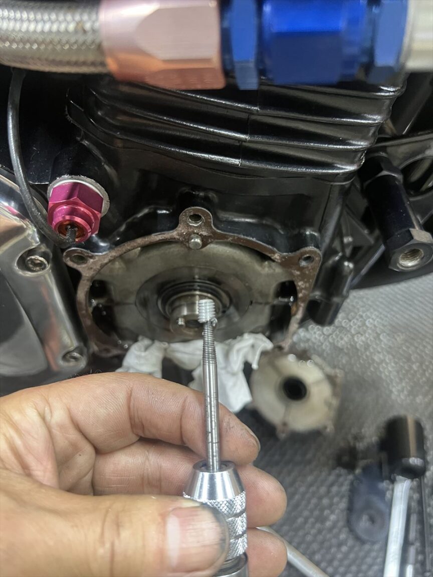 エンジンカバーを外して折れ込みボルトの中心に穴を開けます。このネジ穴はクランクケース内に貫通しているので、折れ込みボルトを中に落とすと厄介です。