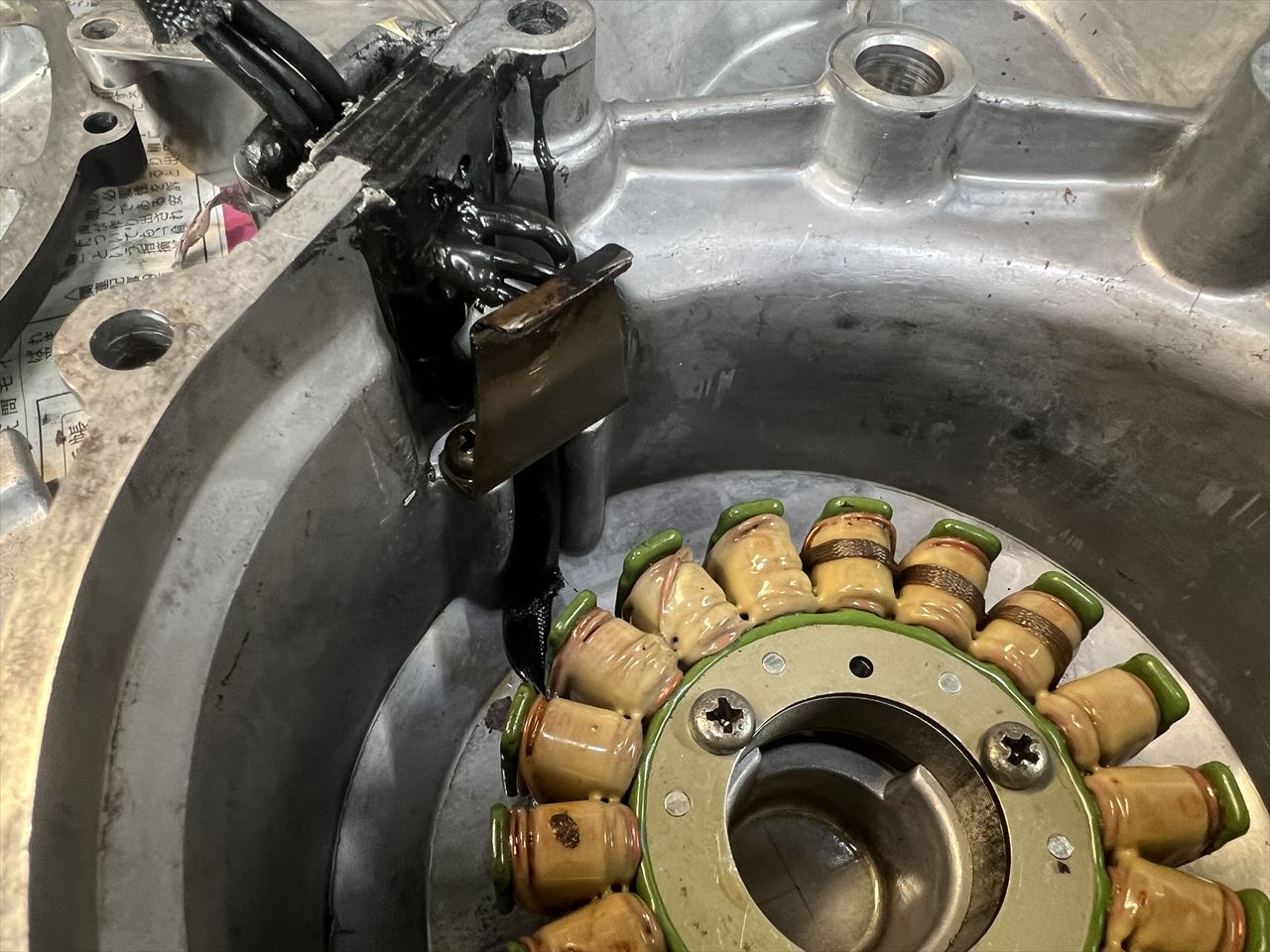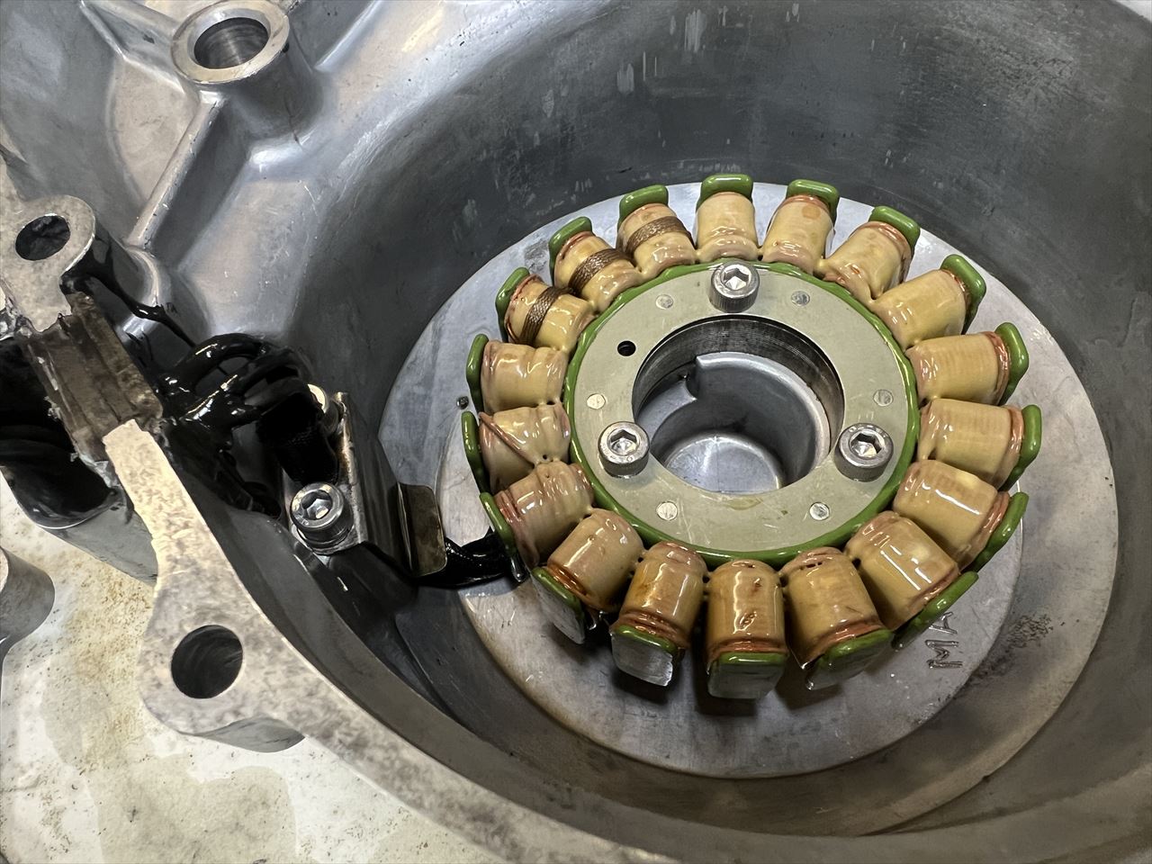 ジェネレーターカバーのハーネスガイドですが、上下逆さまに付いています。ステーターコイルが社外品に交換されているので、その際間違ったのでしょうか。