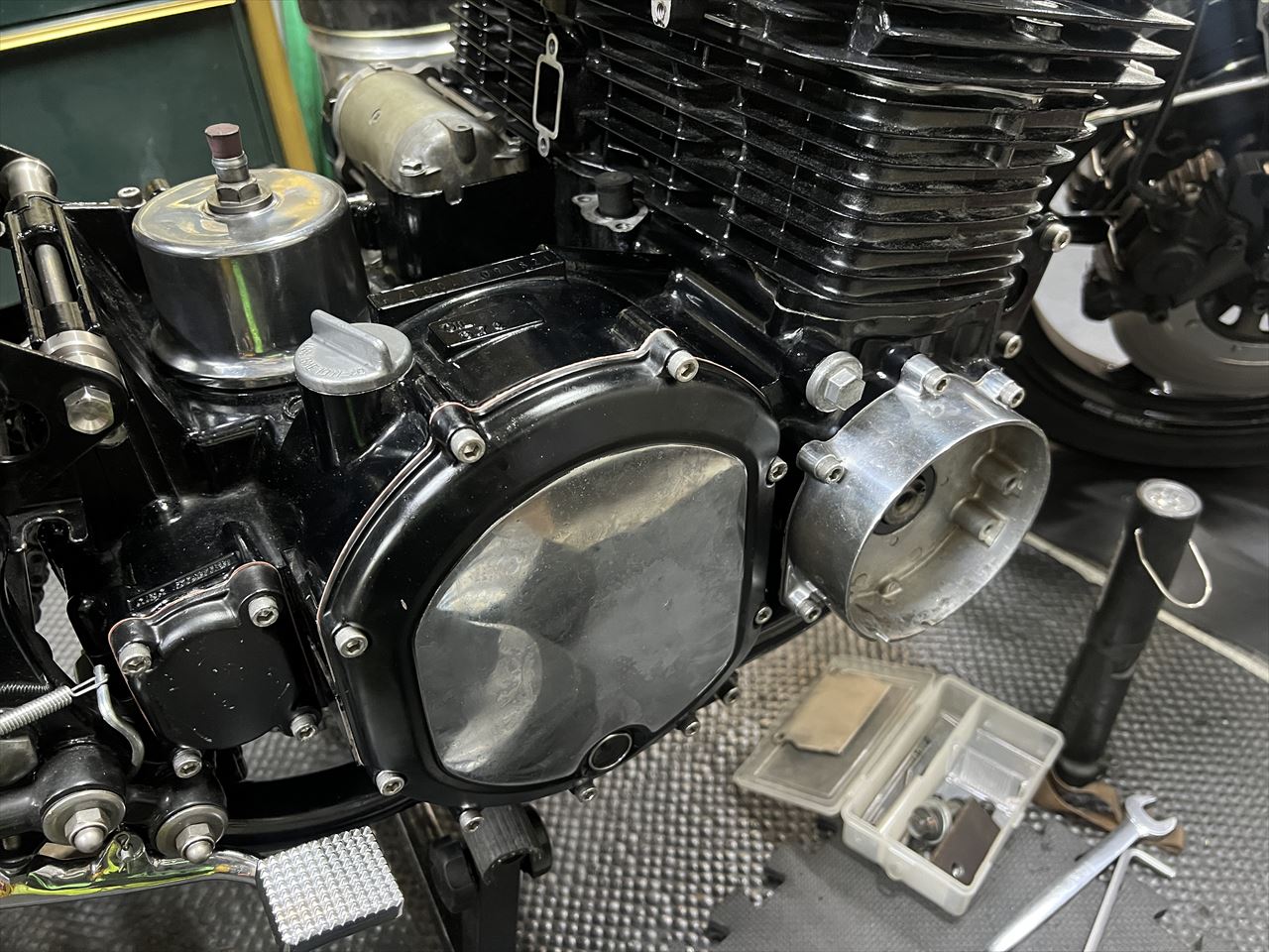 エンジン組み立ての続きです。エンジンカバー類を準備します。ガスケットを剥がして取り付け面をオイルストーンで整えます。