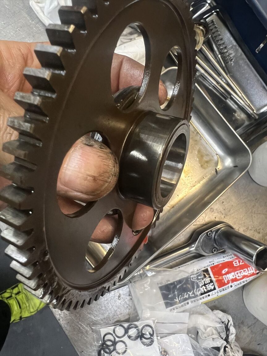 タコメーターギヤはハウジングがかじっていたので、こちらも中古良品に交換します。