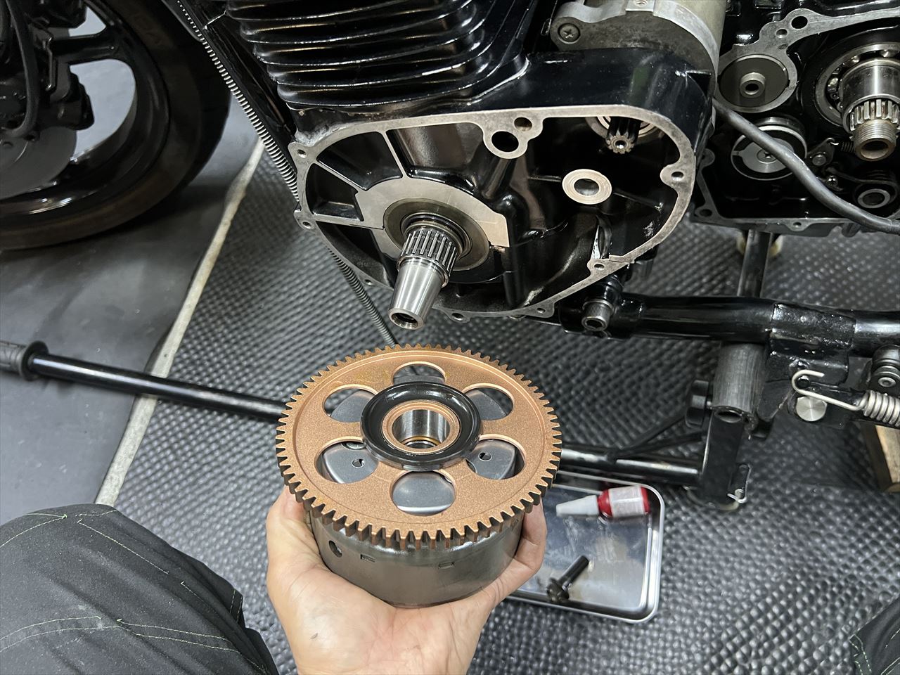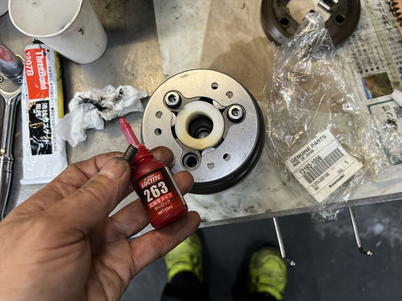 ワンウェイクラッチは緩みやすいので、ボルトにロックタイトを塗布します。