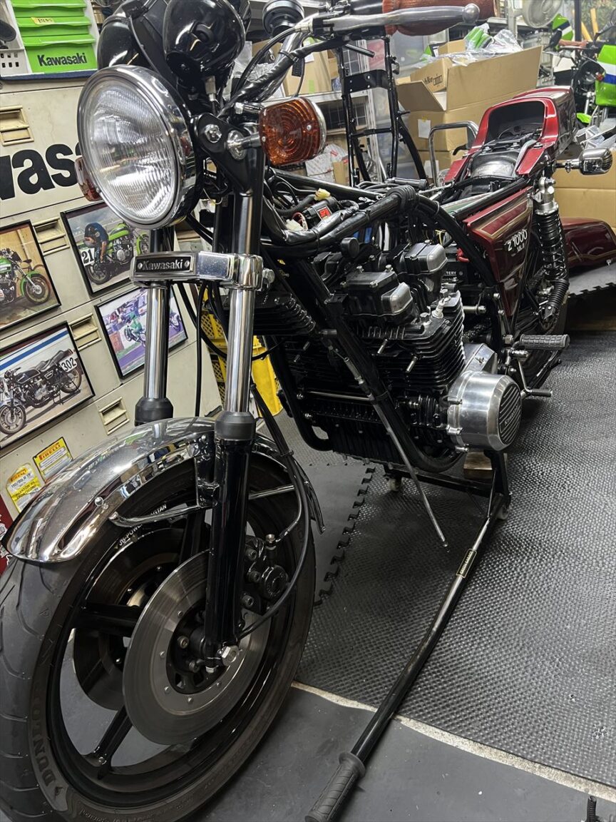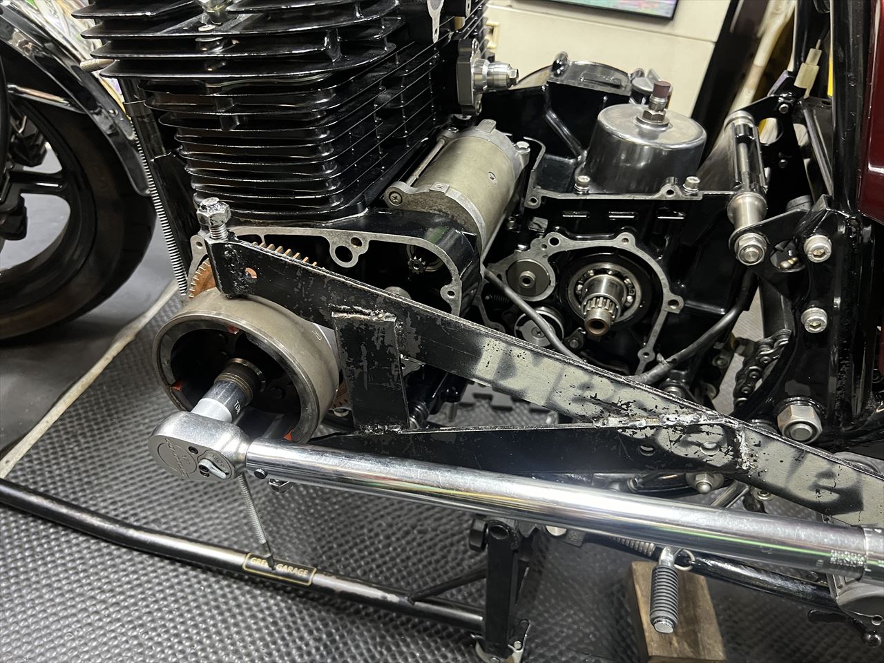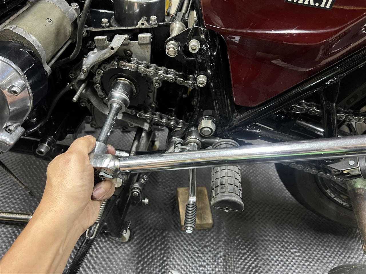 チェーンの張りを一旦調整。スイングアームにモリワキ式の補強が入っていて、この部分はチェーンがばバタつくと干渉し易いのでついチェーンを張り気味にしがちですが、チェーンの張り過ぎは絶対禁物です。